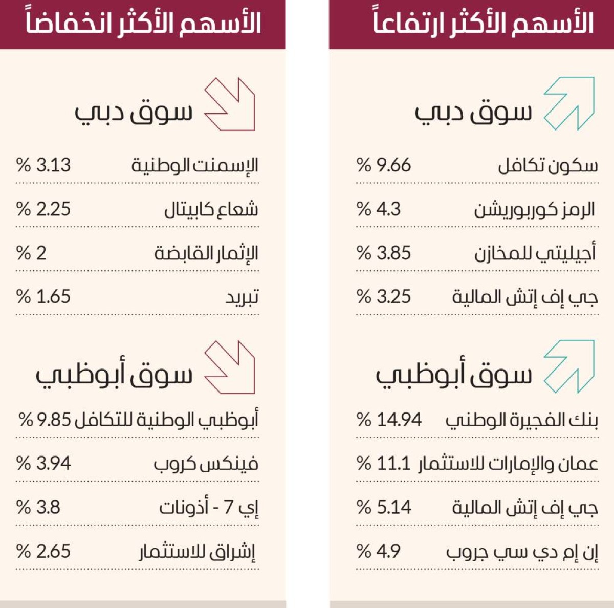 وارتفعت في سوق أبوظبي أسهم بنك الفجيرة الوطني 14.94%، وعمان والإمارات للاستثمار 11.1 %، وجي إف إتش المالية 5.14 %، وإن إم دي سي جروب 4.9 %، في المقابل، تراجعت أسهم أبوظبي الوطنية للتكافل 9.85 %، وفينكس كروب 3.94 %، وإي 7 - أذونات 3.8 %، وإشراق للاستثمار 2.65 %.