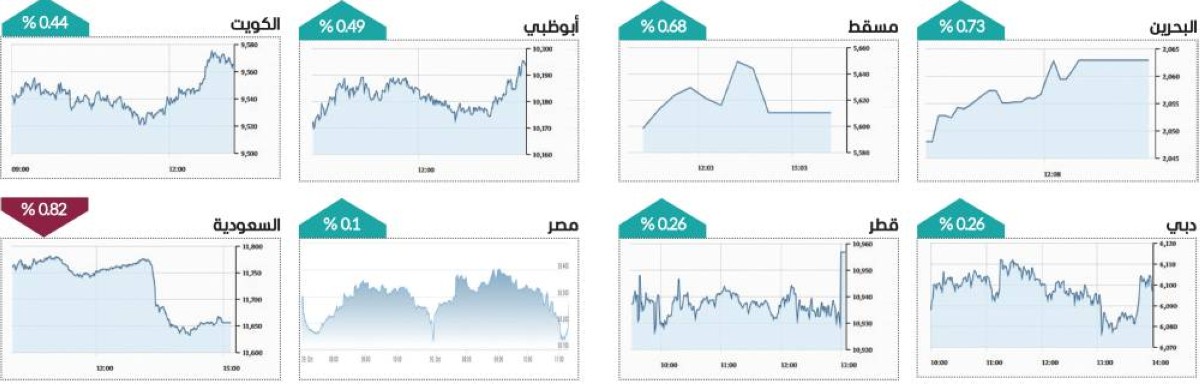 على مستوى البورصات العربية، شهدت مؤشرات أغلب الأسواق ارتفاعاً في الأداء، وارتفعت بورصات الكويت 0.44 %، وقطر 0.26 %، ومسقط 0.68 %، والبحرين 0.73 %، فيما تراجع المؤشر السعودي «تاسي» 0.82 %، وخارج منطقة الخليج، صعد مؤشر بورصة مصر 0.1 %.