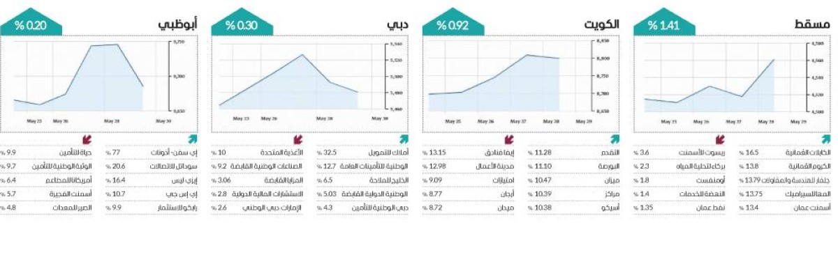 وفي الكويت، سجلت المؤشرات الرئيسة أداءً متبايناً خلال الأسبوع الأخير من شهر مايو، فقد سجل مؤشر السوق الأول نمواً بنحو 0.92% (مكاسب 80.41)، مُنهياً التعاملات عند مستوى 8799.09 نقطة.