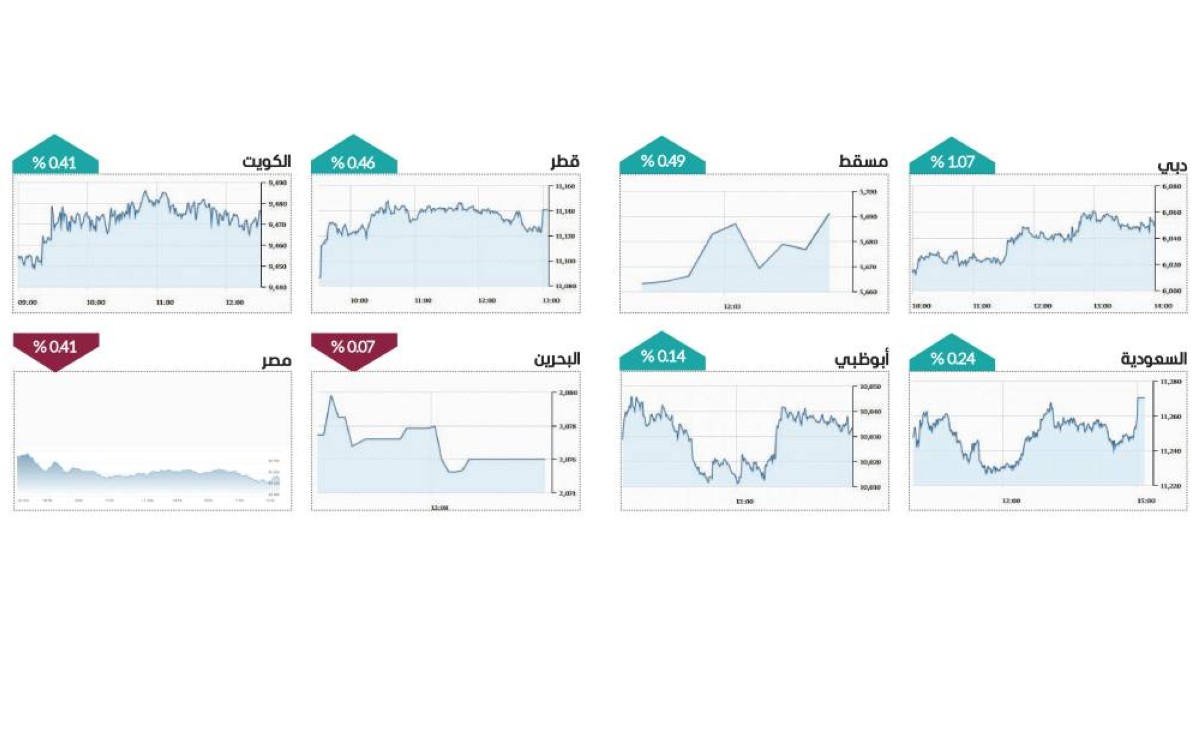 وشهدت أغلب مؤشرات البورصات العربية ارتفاعاً في الأداء، إذ ارتفع المؤشر السعودي 0.24%، والكويتي 0.41%، والقطري 0.46%، وبورصة مسقط 0.49%، فيما تراجعت بورصة البحرين 0.07%، وتراجع مؤشر بورصة مصر 0.41%.