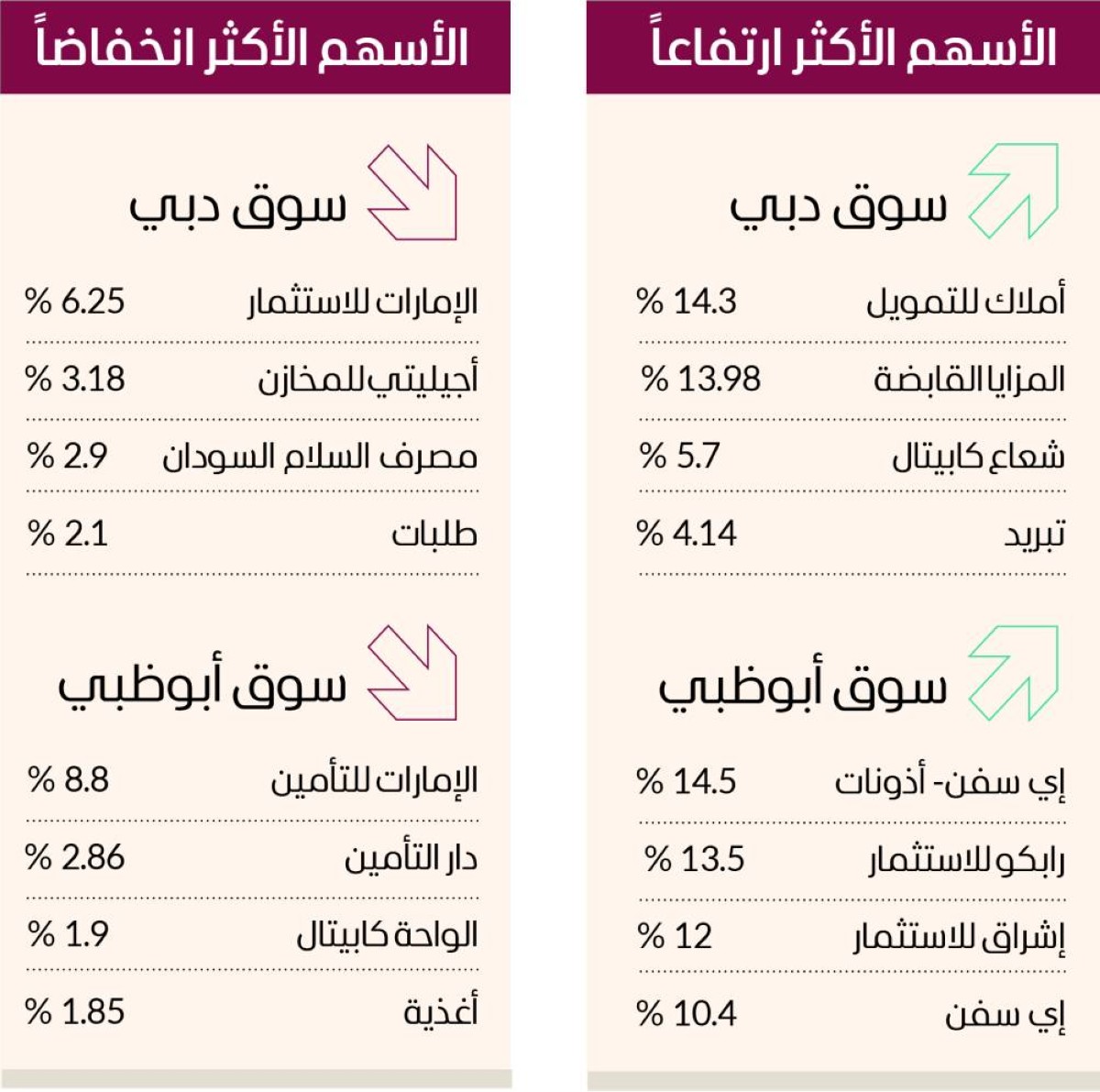 وارتفعت أسهم إي سفن- أذونات 14.5%، ورابكو للاستثمار 13.5%، وإشراق للاستثمار 12%، وإي سفن 10.4%، بينما انخفضت أسهم الإمارات للتأمين 8.8%، ودار التأمين 2.86%، والواحة كابيتال 1.9%، وأغذية 1.85%.