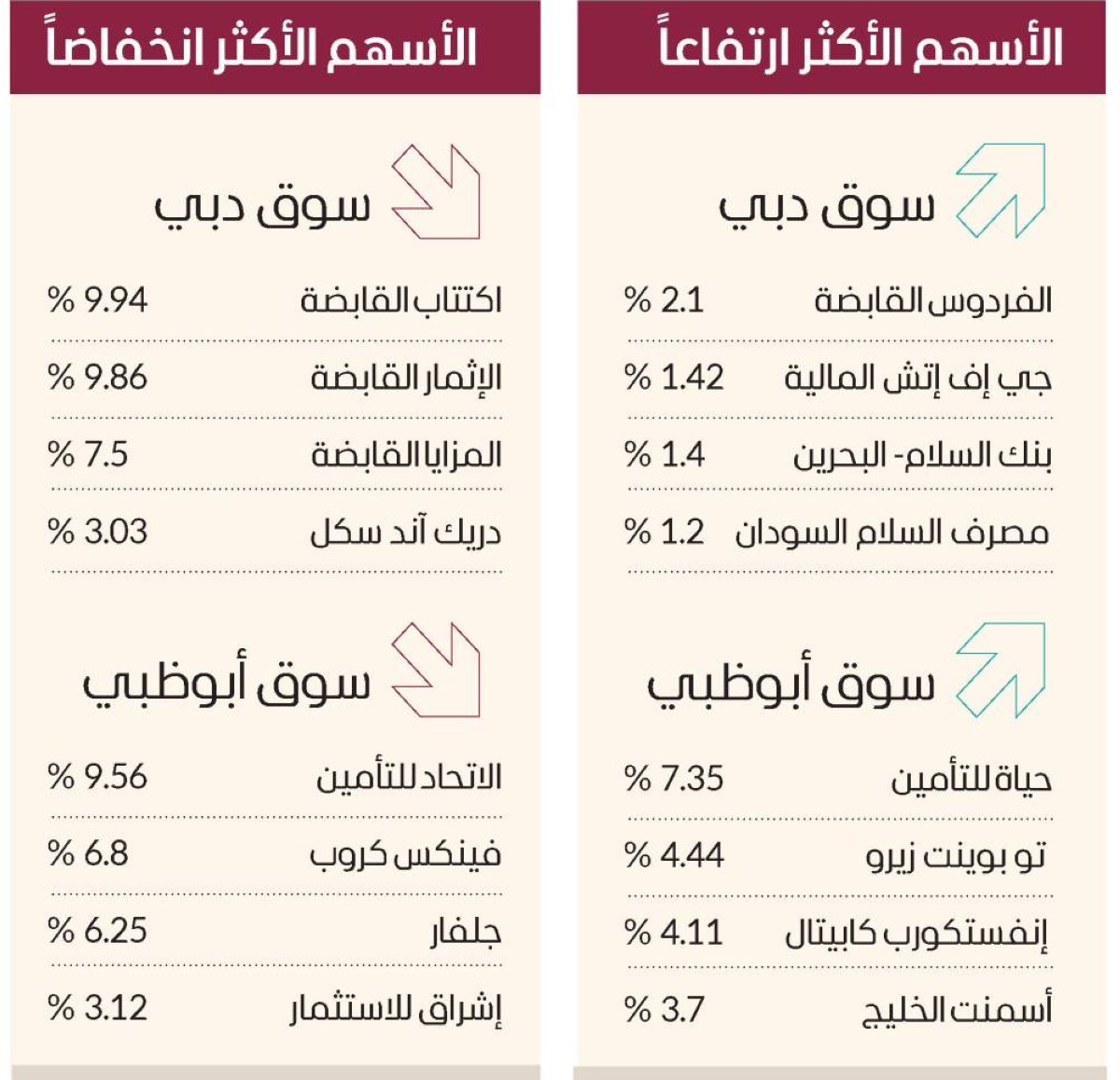 وكان ضمن الأسهم المرتفعة في سوق أبوظبي أسهم حياة للتأمين 7.35%، وتو بوينت زيرو 4.44%، وإنفستكورب كابيتال 4.11%، وأسمنت الخليج 3.7%، في المقابل، انخفضت أسهم اﻻتحاد للتأمين 9.56%، وفينكس كروب 6.8%، وجلفار 6.25%، وإشراق للاستثمار 3.12%.