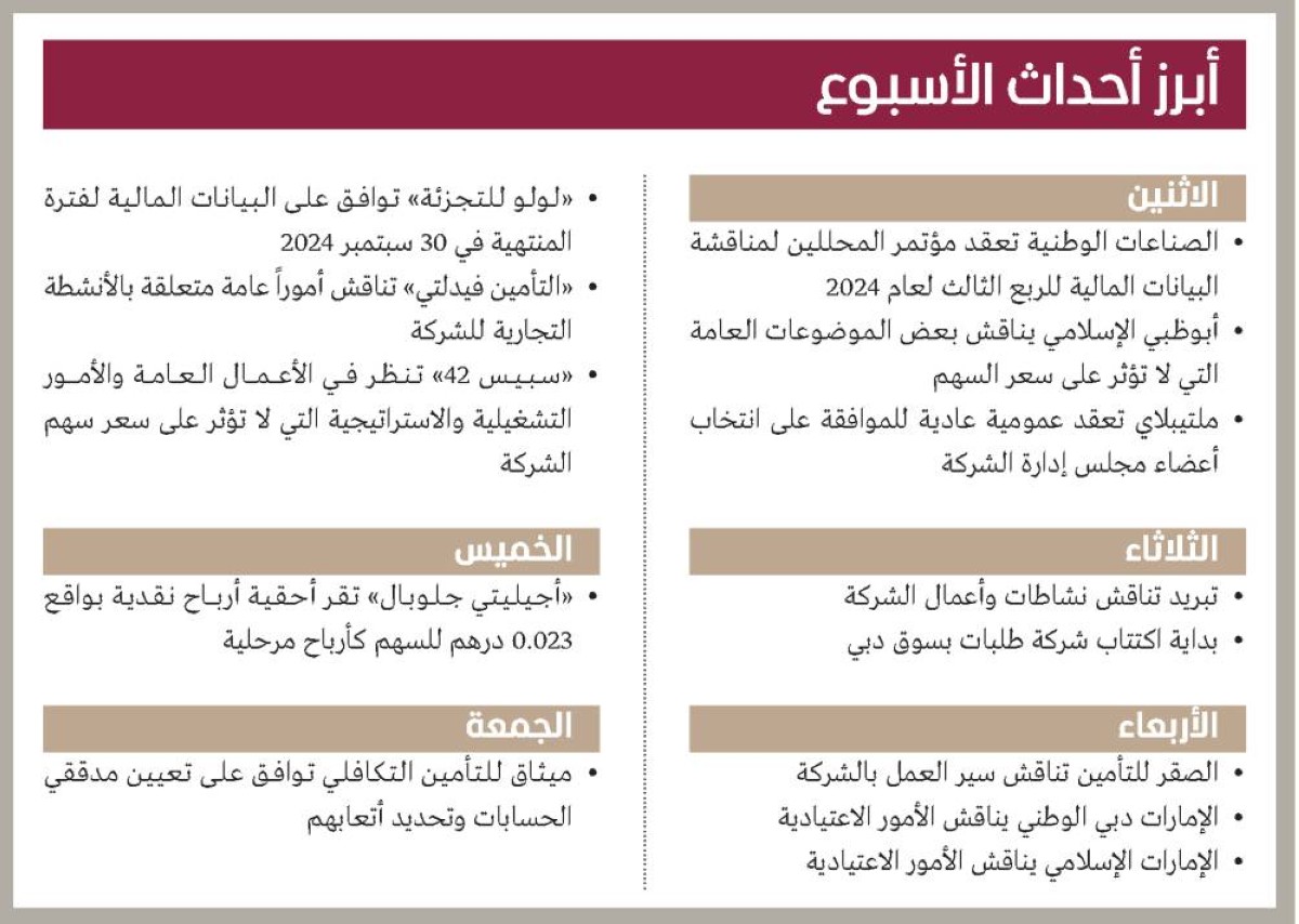 تشهد أسواق الأسهم المحلية أحداثاً عديدة، خلال الأسبوع الجاري، إذ يستعد المستثمرون لحصد ثمار النتائج القوية للشركات والبنوك مع انتهاء موسم إعلان نتائج أعمال البنوك والشركات عن الربع الثالث من عام 2024.