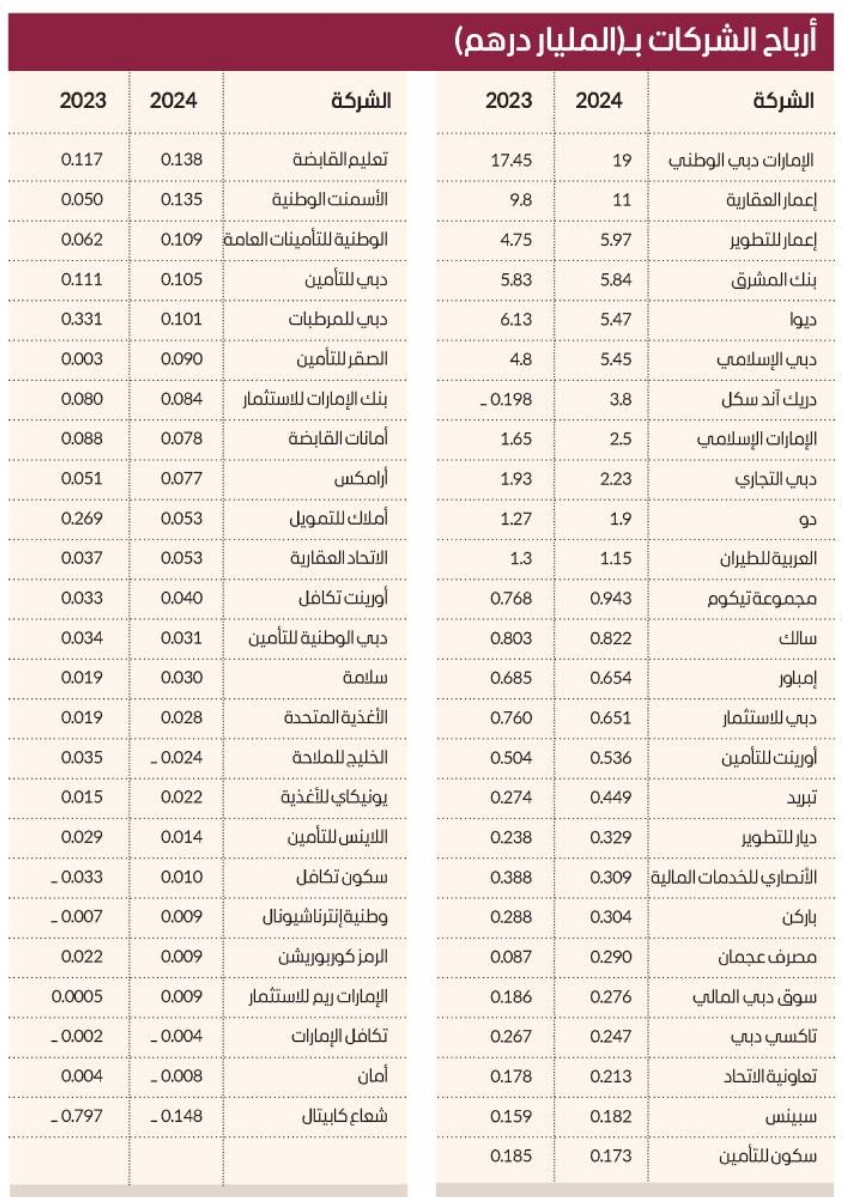 تصدر بنك الإمارات دبي الوطني الشركات الأكثر ربحية، بعد أن سجل أرباحاً صافية بقيمة 19 مليار درهم (شاملة أرباح الإمارات الإسلامي) في 9 أشهر بنمو 9 % عن الفترة المقابلة لعام 2023، وبلغت أرباحه قبل الضريبة 22.14 مليار درهم، وزادت الأصول 14 % إلى 956 مليار درهم، وارتفع إجمالي القروض 9 % إلى 493.8 مليار درهم، والودائع 644.8 مليار درهم بنمو 13 %.