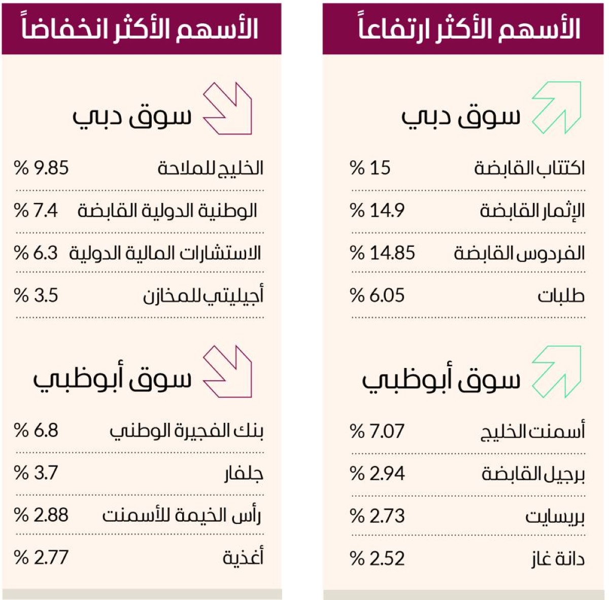 إلى ذلك، أغلق مؤشر فوتسي سوق أبوظبي العام «فادجي» عند 9937.09 نقطة، منخفضاً بـ0.14%. وتصدر «الدار العقارية» النشاط في سوق أبوظبي، مع استحواذه على النصيب الأكبر من إجمالي التداولات بنحو 111.98 مليون درهم، تلاه «أدنوك للغاز» جاذباً 104.6 ملايين درهم، ثم «أدنوك للحفر» بسيولة 91.9 مليون درهم. وشهد سوق أبوظبي تنفيذ صفقة كبيرة مباشرة على أسهم بنك أبوظبي التجاري بقيمة 737.7 مليون درهم، إذ تم تنفيذ الصفقة على 49.8 مليون سهم من أسهم البنك بسعر تنفيذ 14.8 درهماً للسهم الواحد. وارتفعت في سوق أبوظبي أسهم أسمنت الخليج 7.07%، وبرجيل القابضة 2.94%، وبريسايت 2.73%، ودانة غاز 2.52%، في المقابل، تراجعت أسهم بنك الفجيرة الوطني 6.8%، وجلفار 3.7%، ورأس الخيمة للأسمنت 2.88%، وأغذية 2.77%.