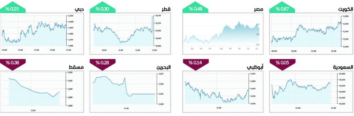 وعلى مستوى البورصات العربية، شهدت مؤشرات الأسواق تبايناً في الأداء، وانخفض المؤشر السعودي «تاسي» 0.05%، ومسقط 0.38%، والبحرين 0.28%، فيما ارتفعت بورصتا الكويت 0.87%، وقطر 0.30%، وخارج منطقة الخليج، صعد مؤشر بورصة مصر 0.48%.
