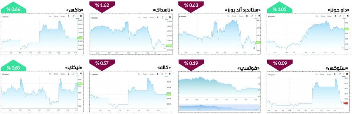 وأغلق مؤشر «ستوكس 600» الأوروبي عند 578.24 نقطة مقابل 578.77 نقطة في الأسبوع السابق، بتراجع هامشي بلغ 0.53 نقطة تعادل 0.09%، وسجل مؤشر «داكس» الألماني أفضل أداء بين المؤشرات الأوروبية، مرتفعاً إلى 24186.49 نقطة مقارنة بــ 24028.14 نقطة، محققاً مكاسب قدرها 158.35 نقطة أو 0.66 %. كما انخفض مؤشر «كاك» الفرنسي إلى 8068.62 نقطة مقابل 8114.74 نقطة، ليفقد 46.12 نقطة تعادل 0.57 %، أما مؤشر «فوتسي 100» البريطاني فقد أنهى الأسبوع على انخفاض إلى 9649.03 نقطة مقابل 9667.01 نقطة، بخسارة بلغت 17.98 نقطة أو 0.19 %.