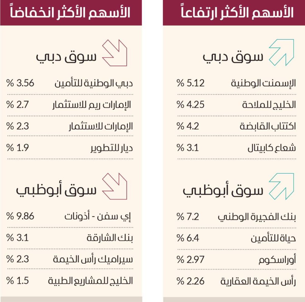 وارتفعت في سوق أبوظبي أسهم بنك الفجيرة الوطني 7.2%، وحياة للتأمين 6.4%، وأوراسكوم 2.97%، ورأس الخيمة العقارية 2.26%، في المقابل، تراجعت أسهم إي سفن - أذونات 9.86%، وبنك الشارقة 3.1%، وسيراميك رأس الخيمة 2.3%، والخليج للمشاريع الطبية 1.5%.