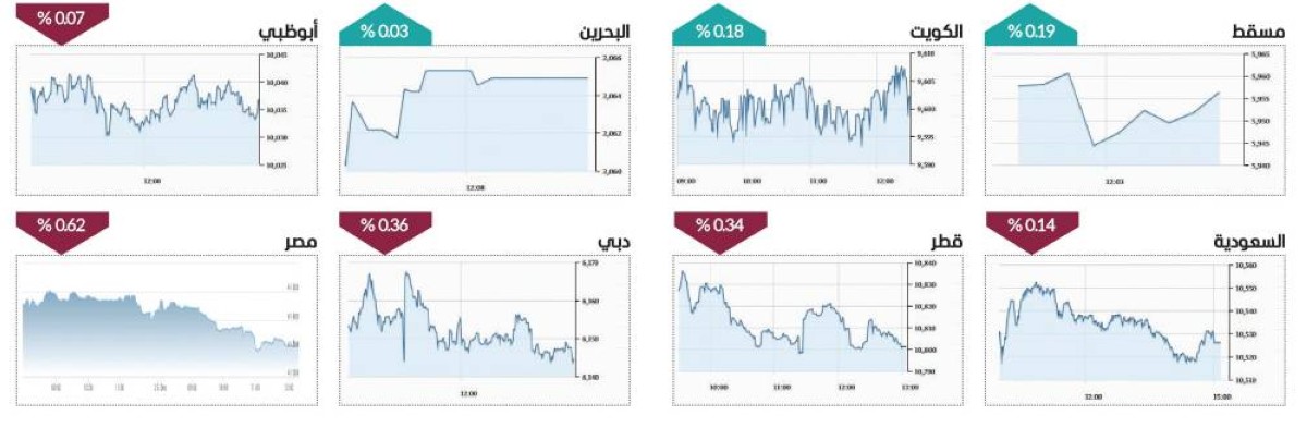وشهدت أغلب مؤشرات البورصات العربية تراجعاً في الأداء، إذ تراجع المؤشر السعودي «تاسي» 0.14%، والقطري 0.34%، فيما ارتفعت بورصات الكويت 0.18%، ومسقط 0.19%، والبحرين 0.03%، وخارج منطقة الخليج، انخفض مؤشر بورصة مصر 0.62%.