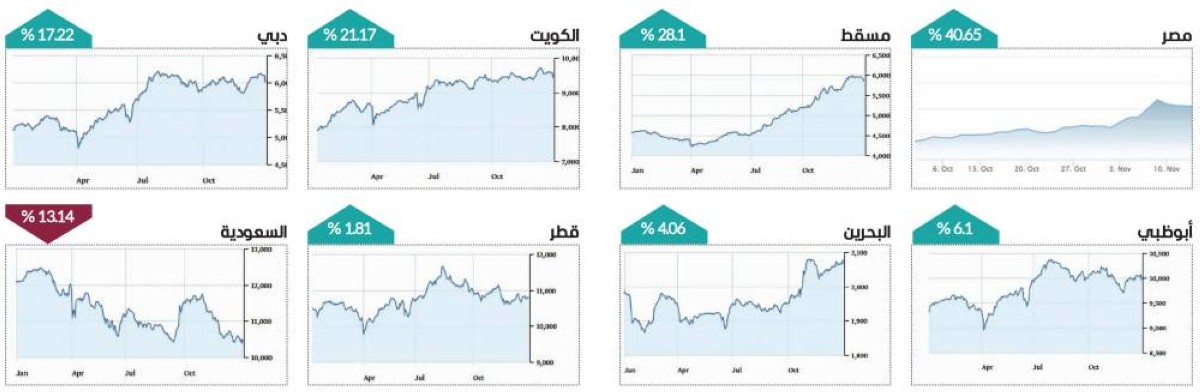 وأظهر رصد «البيان»، تصدر مؤشرات أسواق دبي والكويت ومسقط مكاسب الأسواق الخليجية خلال 2025، ونجح سوق دبي المالي في تحقيق أداء قوي خلال العام، ليأتي ضمن الأفضل على مستوى البورصات الخليجية، مدعوماً بقوة الاقتصاد الوطني والمكاسب القوية للأسهم القيادية المدرجة، إلى جانب زيادة الطلب من جانب المؤسسات والمستثمرين الدوليين. وفي 2025، ارتفعت بورصات مسقط 28.1%، والكويت 21.17%، والبحرين 4.06%، وقطر 1.81%، في حين تراجع مؤشر السوق السعودي «تاسي» بنسبة 13.14%، مخالفاً الاتجاه الصاعد للأسواق الخليجية. وفي سوق دبي، اتجه المستثمرون الأجانب (غير العرب) نحو الشراء في سوق دبي بصافي استثمار 5.8 مليارات درهم خلال 2025، بعد تحقيقهم مشتريات بقيمة 72.7 مليار درهم مقابل مبيعات 66.9 مليار درهم.