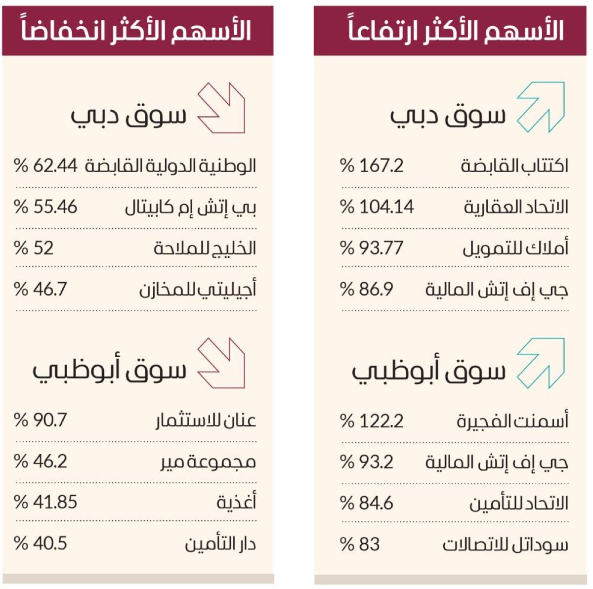 وتصدر سهم «اكتتاب القابضة» ارتفاعات سوق دبي بنمو 167.2%، وصعدت أسهم «الاتحاد العقارية» 104.14%، و«أملاك للتمويل» 93.77%، و«جي إف إتش المالية» 86.9%، و«دبي للاستثمار» 65.74%، و«العربية للطيران» 51.3%، و«تكافل الإمارات» 36.1%، و«الإمارات الإسلامي» 31%، و«دو» 30.84%، و«دبي الإسلامي» 30.75%، و«الأسمنت الوطنية» 29.9%، و«الإمارات دبي الوطني» 29.84%، و«دبي التجاري» 29.1%. في المقابل، تراجعت أسهم «الوطنية الدولية القابضة» 62.44%، و«بي إتش إم كابيتال» 55.46%، و«الخليج للملاحة» 52%، و«أجيليتي للمخازن» 46.7%.