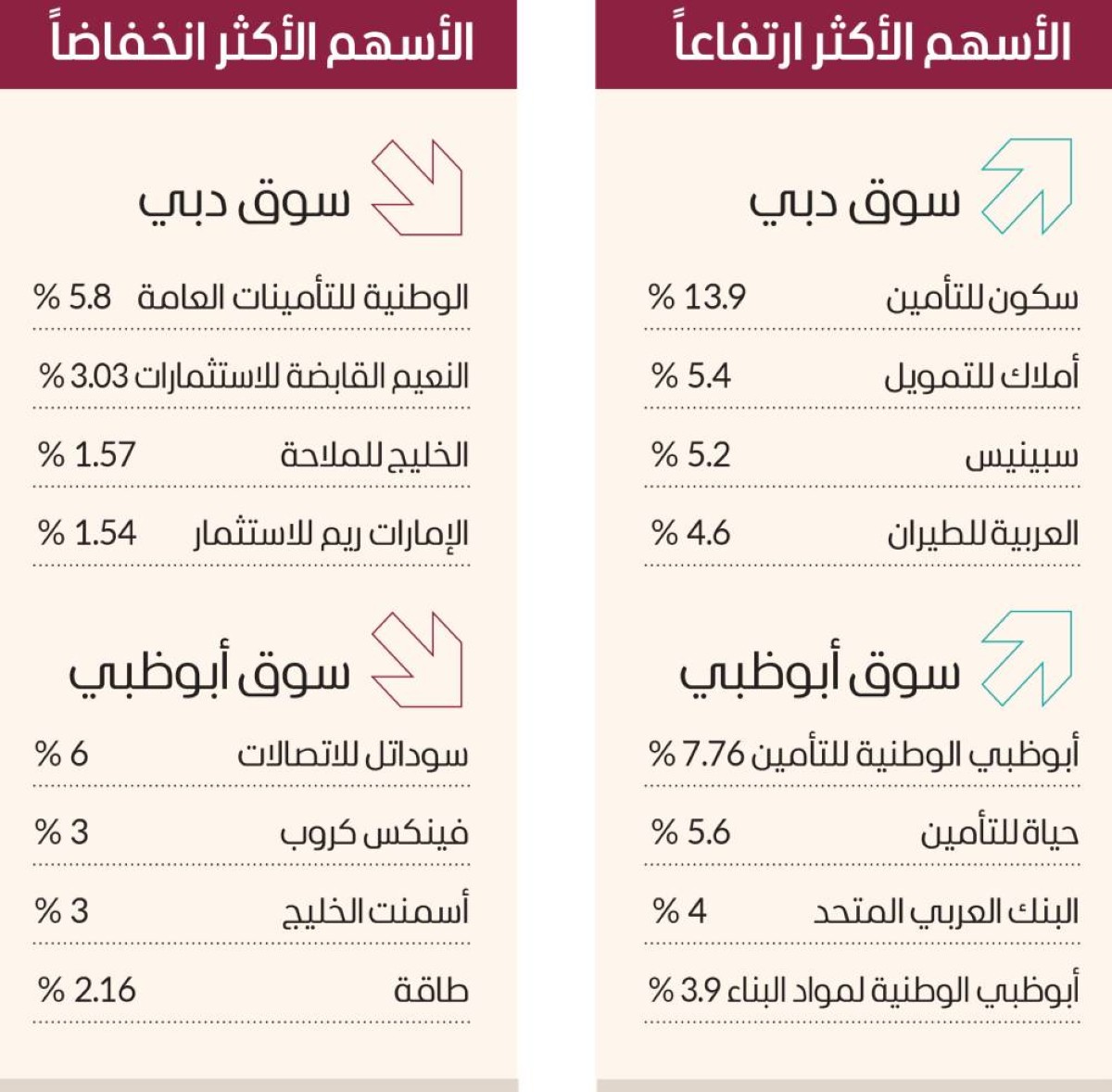 وارتفعت في سوق أبوظبي أسهم أبوظبي الوطنية للتأمين 7.76 %، وحياة للتأمين 5.6 %، والبنك العربي المتحد 4 %، وأبوظبي الوطنية لمواد البناء 3.9 %، في المقابل، انخفضت أسهم سوداتل للاتصالات 6 %، وفينكس كروب 3 %، وأسمنت الخليج 3 %، وطاقة 2.16 %.