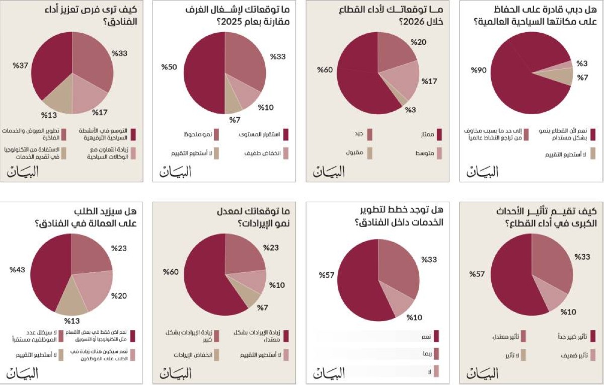 وكشف استبيان أجرته صحيفة «البيان»، شمل 30 مسؤولاً فندقياً، أن قطاع الفنادق في دبي يتجه نحو تسجيل أداء قياسي خلال 2026، مع مؤشرات قوية على التفاؤل. وأظهرت النتائج ثقة كبيرة في مستقبل القطاع، حيث أعرب 60 % من المشاركين عن تفاؤلهم بأداء السوق، وتوقع 83 % زيادة في الإيرادات الفندقية، فيما شدد 90 % على الدور الحيوي للفعاليات في تعزيز الأداء الفندقي وتحقيق النمو المستدام.