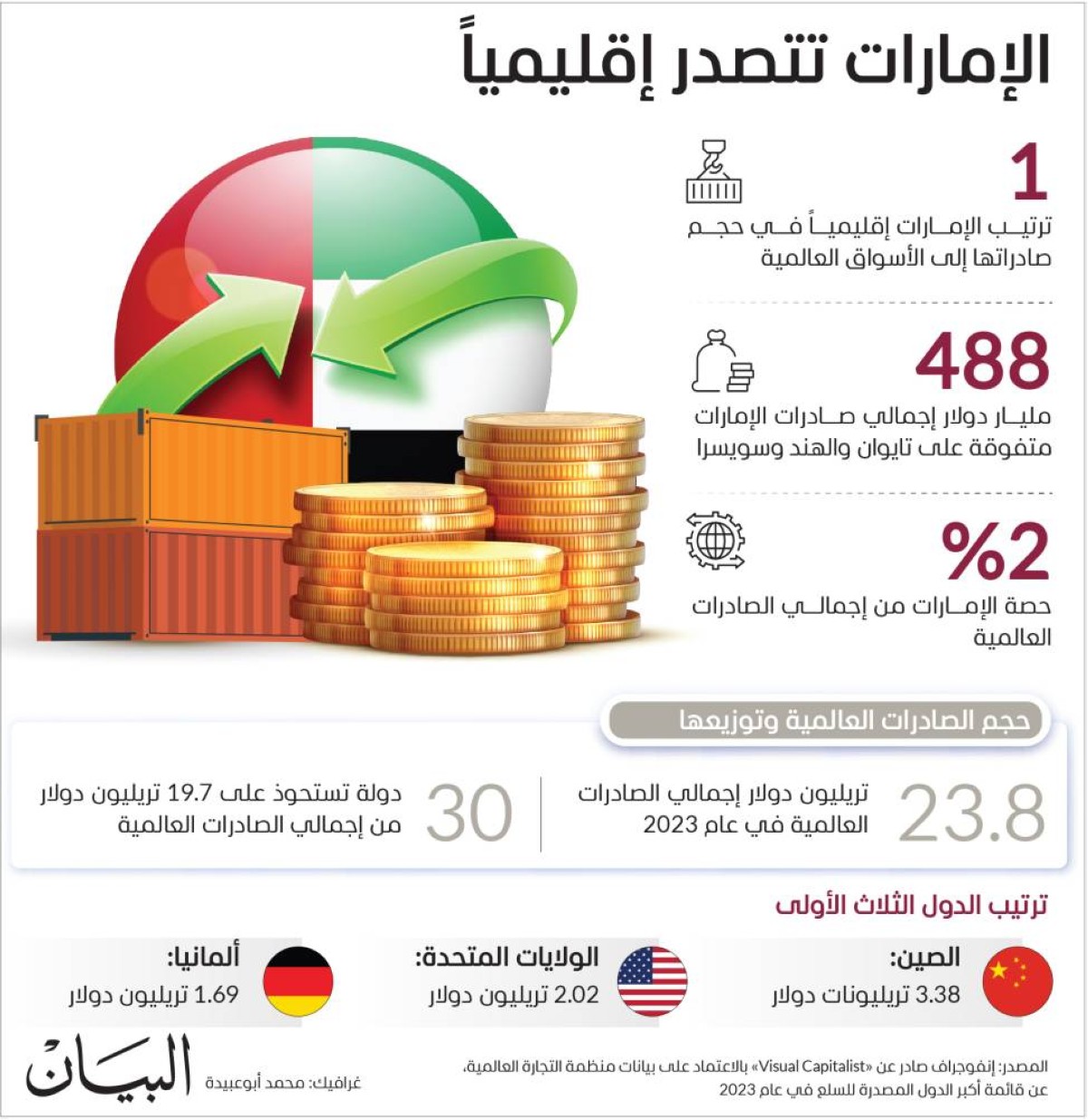 عززت دولة الإمارات بنهاية 2023 موقعها كالمُصدِّر الأول في العالمين العربي والإسلامي، بصادرات قاربت قيمتها نصف تريليون دولار ونسبة مساهمة بلغت 2% من حركة البضائع العالمية.