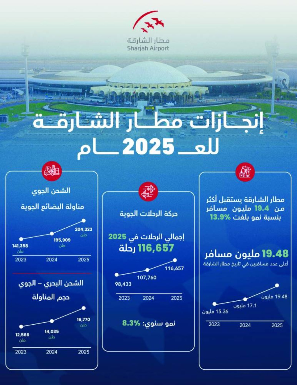 أعلنت هيئة مطار الشارقة الدولي عن تحقيق نتائج قياسية خلال عام 2025، باستقبال المطار 19.48 مليون مسافر مقارنة بـ17.1 مليوناً في 2024 محققاً نسبة نمو بلغت 13.9%، في أداء يواصل مساره التصاعدي في حركة المسافرين والطيران والشحن الجوي ليرسخ مكانة إمارة الشارقة مركزاً محورياً في النقل الجوي والخدمات اللوجستية.