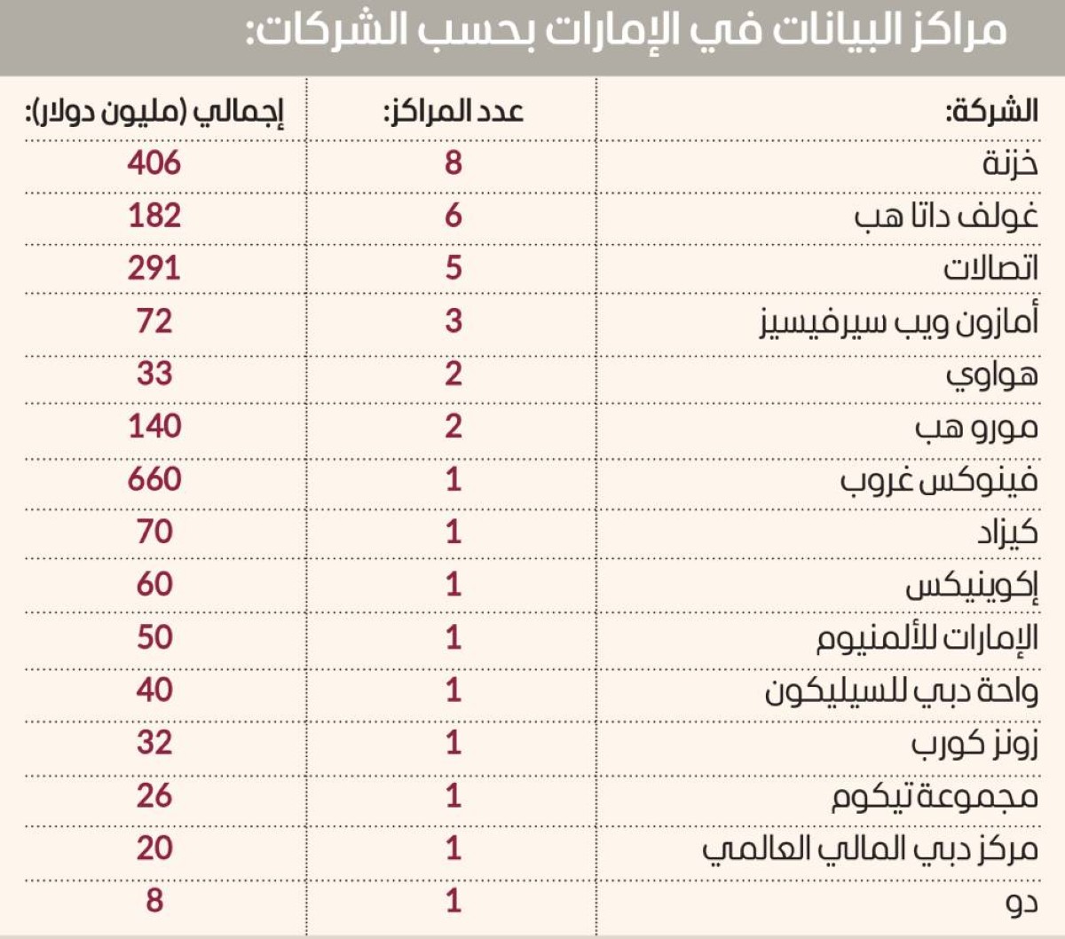 وتمتلك الإمارات أكبر عدد من مراكز البيانات القائمة بالفعل في المنطقة وهو 35 مركزاً، مقارنة بـ12 مركزاً في عُمان، و11 مركزاً في السعودية، ويبلغ إنفاق الموظف على السحابة العامة 228 دولاراً، وهو الأعلى في المنطقة وفقاً لبيانات مجموعة بوسطن الاستشارية.