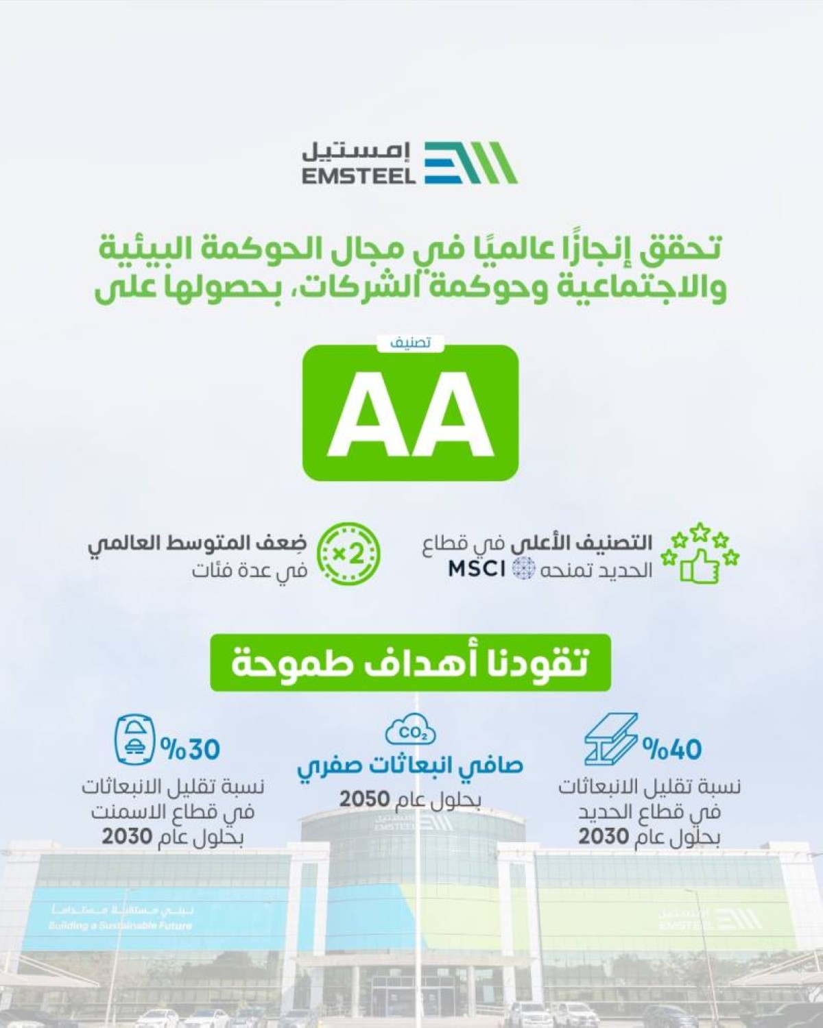 وقال المهندس سعيد غمران الرميثي، الرئيس التنفيذي لمجموعة «إمستيل»: «يشكل حصولنا على التصنيف الرائد (AA) من مؤشر مورغان ستانلي كابيتال إنترناشيونال MSCI، في مجال الحوكمة البيئية والاجتماعية وحوكمة الشركات، دليلاً واضحاً على التزام إمستيل العميق بالريادة في الاستدامة الصناعية. ويعكس هذا الإنجاز متانة منظومتنا المؤسسية، وكفاءة كوادرنا، وإدراكنا العميق لمسؤوليتنا تجاه البيئة والمجتمع. وانطلاقاً من التزامنا بأهداف دولة الإمارات للوصول إلى الحياد المناخي بحلول عام 2050، فإن هذا التصنيف يعزز عزمنا على المضي قدماً في تقديم حلول صناعية مسؤولة، وخلق قيمة مستدامة لمساهمينا، والإسهام في بناء مستقبل أكثر توازناً للأجيال القادمة».