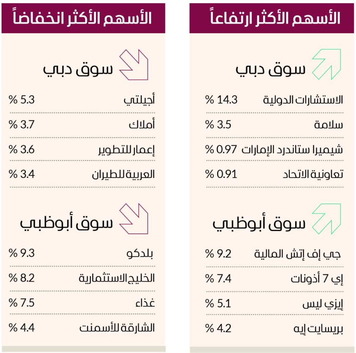 وكان أكثر الأسهم المرتفعة «الاستشارات المالية الدولية» بنسبة 14.3% وسهم شركة «سلامة» بنسبة 3.5% وسهم «شيميرا ستاندرد الإمارات» بنسبة 0.97% ثم سهم «تعاونية الاتحاد» محققاً نسبة نمو 0.91% وسهم «وطنية» بنسبة 0.7% ثم سهم «تيكوم» بنسبة نمو 0.6%.