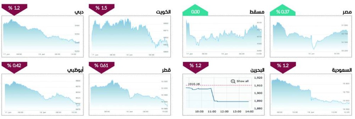 واستقر مؤشر بورصة مسقط دون تغيير، فيما تراجع مؤشر بورصة الكويت الرئيسي بنسبة 1.5%، وانخفض مؤشر بورصة البحرين 1.2 %، فيما انخفض مؤشر بورصة قطر بنسبة 0.61.
