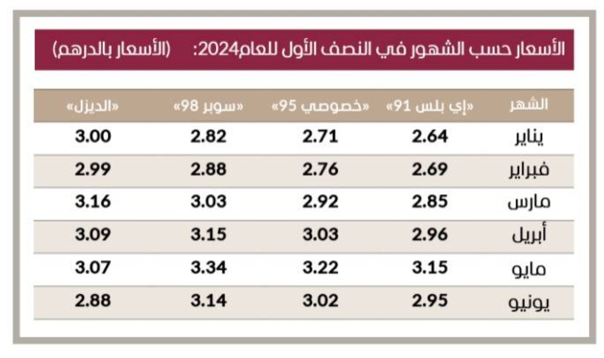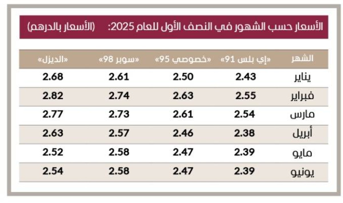 شهد شهر يونيو 2025 تراجع أسعار البنزين بمقدار يتراوح بين 55 و56 فلساً وبنسبة نزول تتراوح بين 18 و19% مقارنة بأسعار يونيو 2024، وانخفض سعر لتر البنزين السوبر «98» بمقدار 56 فلساً من 3.14 دراهم في يونيو 2024 إلى 2.58 درهم في يونيو الماضي بنسبة نزول تناهز 18%، كما تراجع لتر البنزين خصوصي «95» بمقدار 55 فلساً من 3.02 دراهم في يونيو 2024 إلى 2.47 درهم في يونيو الماضي بنسبة نزول تتجاوز 18%، وكذلك تراجع سعر لتر بنزين «إي بلس 91» بمقدار 56 فلساً من 2.95 درهم في يونيو 2024 إلى 2.39 درهم في يونيو الماضي وبنسبة نزول تناهز 19%. كما تراجع سعر لتر الديزل بمقدار 34 فلساً من 2.88 دراهم في يونيو 2024 ليستقر عند 2.54 درهم في يونيو 2025 بنسبة نزول تناهز 12%.