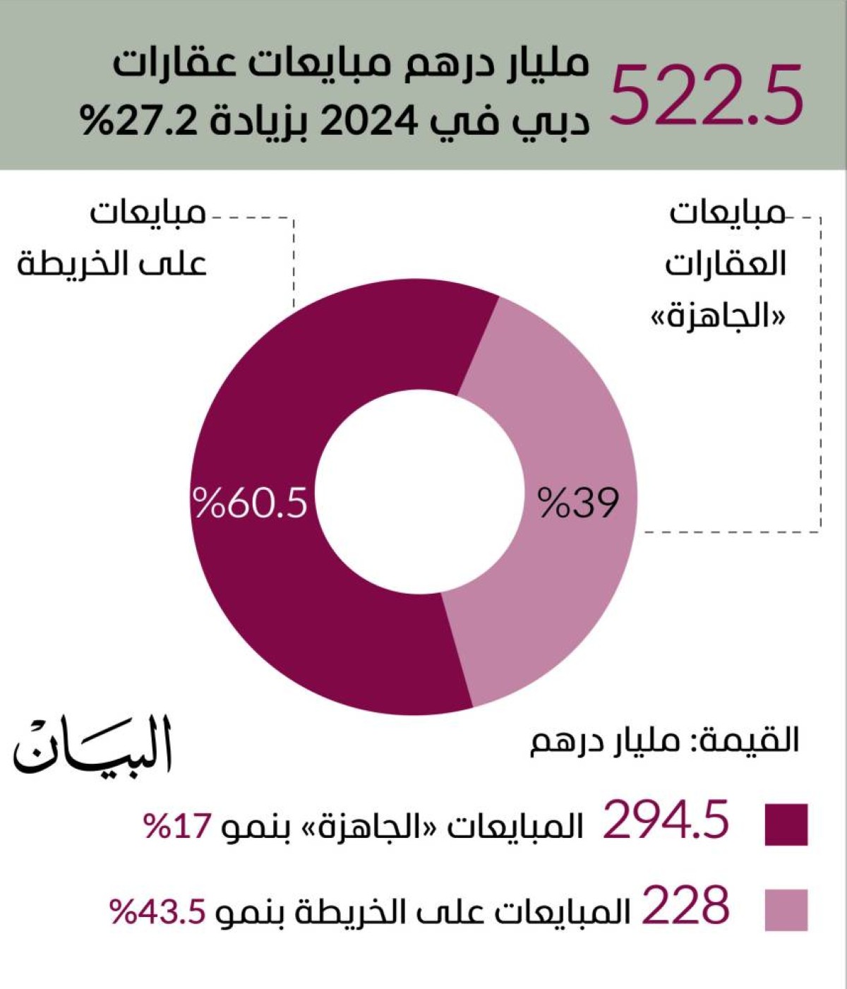 وكشفت «بروبرتي فايندر»، بوابة التكنولوجيا العقارية الرائدة في الشرق الأوسط وشمال أفريقيا، أن سوق العقارات في دولة الإمارات يواصل تحقيق معدلات نمو لافتة ونتائج إيجابية، وأظهر التقرير تسجيل سوق دبي العقاري أرقاماً غير مسبوقة في عام 2024، حيث وصل عدد المبايعات إلى 180,987 معاملة، بلغت قيمتها 522.5 مليار درهم، بنمو كبير في عدد المبايعات قدره 36.5%، وزيادة في القيمة بلغت 27.2% بالمقارنة مع عام 2023. ويعود السبب الرئيس في هذا الارتفاع إلى الزيادة الكبيرة في المبيعات على الخريطة، التي شكلت 60.5% من إجمالي عدد المبايعات، بالمقارنة مع 43.6% في العام الماضي.
