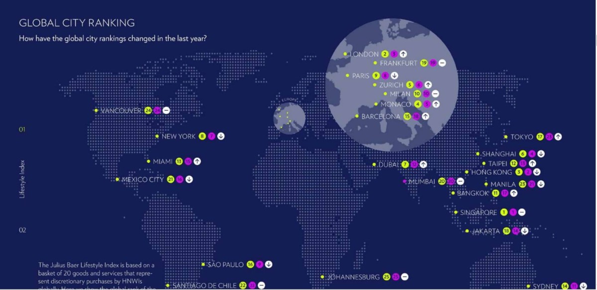 ولا يزال تصنيف المدن يشهد مستويات عالية من التنافس، حيث حافظت سنغافورة على مكانتها باعتبارها أغلى مدينة لأصحاب الملاءة المالية العالية على مستوى العالم، تليها لندن التي تقدمت إلى المركز الثاني، بينما جاءت هونج كونج في المركز الثالث. وشهد التصنيف تغييرات كبيرة في المراكز، حيث صعد كل من بانكوك وطوكيو ستة مراكز، وواصلت دبي تحقيق مراكز أعلى.