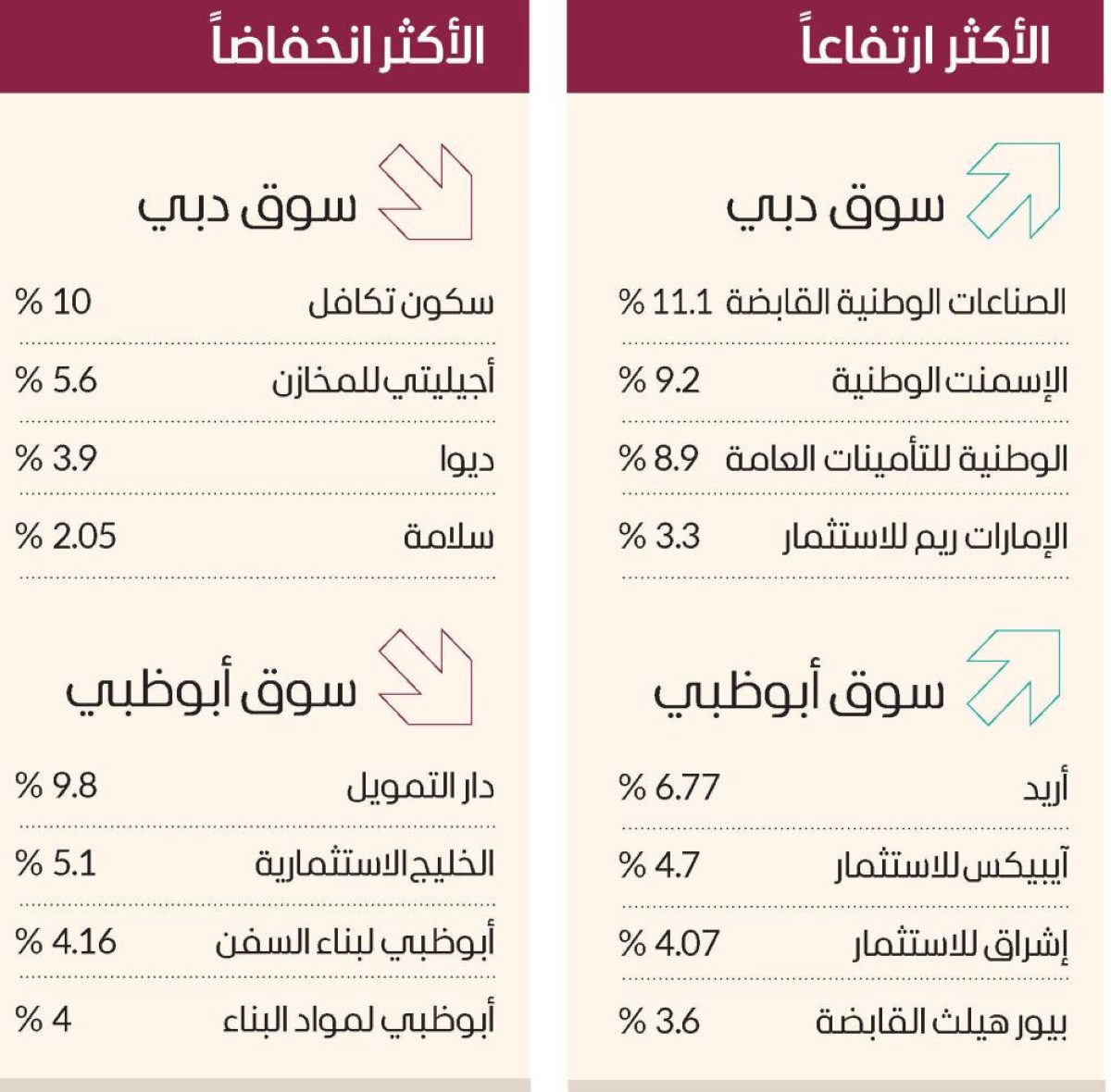 وتصدر سهم «الصناعات الوطنية القابضة» ارتفاعات 18 سهماً بالسوق مرتفعاً 11.1%، وصعدت في سوق دبي أسهم «الإسمنت الوطنية» 9.2%، و«الوطنية للتأمينات العامة» 8.9%، و«الإمارات ريم للاستثمار» 3.3%، وزاد «بنك الإمارات دبي الوطني» 0.91%.