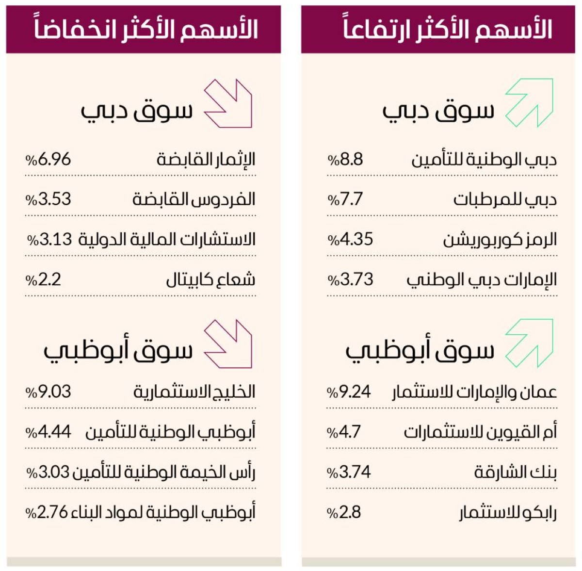 وصعدت في سوق أبوظبي أسهم عمان والإمارات للاستثمار 9.24%، وأم القيوين للاستثمارات 4.7%، وبنك الشارقة 3.74%، ورابكو للاستثمار 2.8%، فيما انخفضت أسهم الخليج اﻻستثمارية 9.03%، وأبوظبي الوطنية للتأمين 4.44%، ورأس الخيمة الوطنية للتأمين 3.03%، وأبوظبي الوطنية لمواد البناء 2.76%.