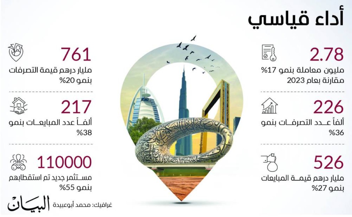 جاء ذلك خلال اطّلاع سموّ الشيخ حمدان بن محمد بن راشد آل مكتوم على النتائج القياسية التي حققها القطاع العقاري في إمارة دبي خلال عام 2024، حيث سجّل القطاع أداءً استثنائياً يعكس مكانة دبي كوجهة استثمارية عالمية‘ إذ تم إنجاز 2.78 مليون معاملة عقارية في هذا العام، وهو الرقم الأعلى على الإطلاق في تاريخها من حيث التعاملات العقاريّة الإجماليّة (بما يشمل التصرفات العقاريّة والمعاملات الإيجاريّة)، محققاً زيادة بنسبة 17% مقارنة بالعام 2023، في حين بلغ عدد التصرفات العقارية 226 ألف تصرف بقيمة إجمالية بلغت 761 مليار درهم، بنمو نسبته 36% من حيث العدد و20% من حيث القيمة مقارنة بالفترة ذاتها.