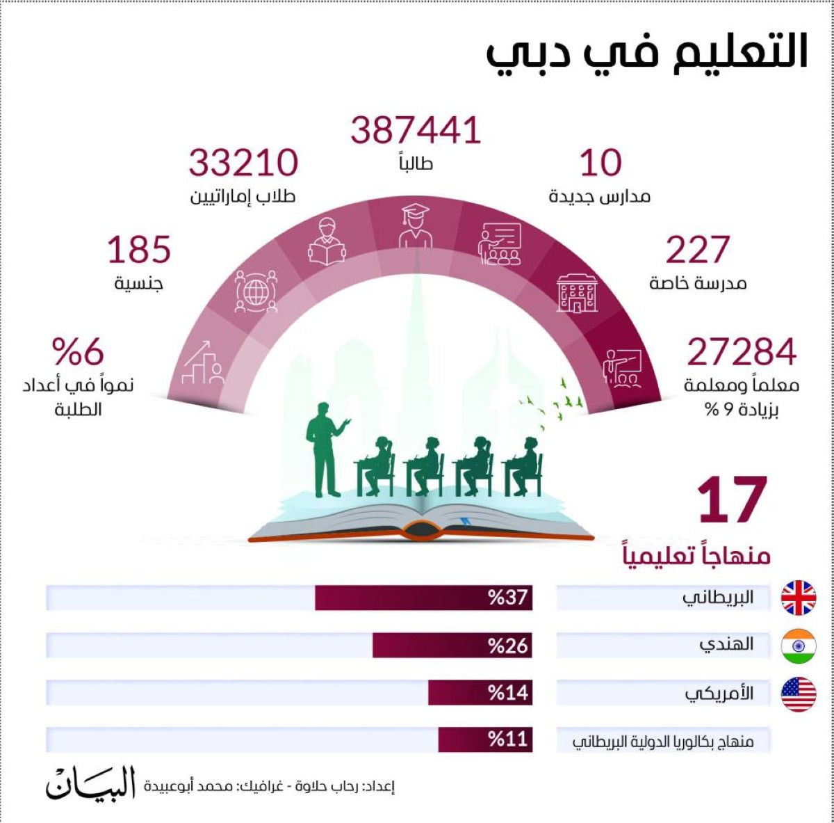 وحرصت «البيان» على استطلاع آراء عدد من المستثمرين والخبراء، الذين أسهموا في رسم ملامح المشهد التعليمي المتطور، في وقت سجلت المدارس الخاصة في إمارة دبي نمواً في أعداد الطلبة بنسبة 6 % العام الدراسي الحالي 2024- 2025، وذلك وفقاً للتقرير الدوري لهيئة المعرفة والتنمية البشرية بدبي، الذي أشار إلى افتتاح 10 مدارس خاصة جديدة في العام الدراسي الحالي، ليصل بذلك إجمالي عدد المدارس الخاصة في دبي إلى 227 مدرسة، تستقبل 387,441 طالباً وطالبة ينتمون إلى 185 جنسية.