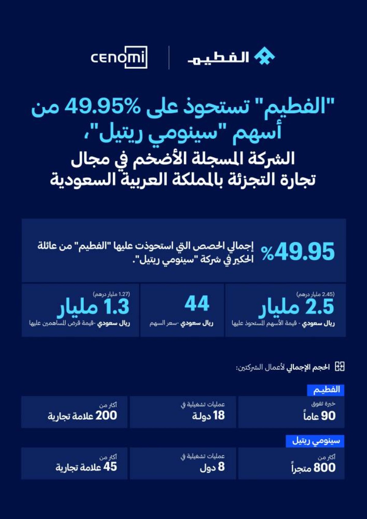 وبموجب هذه الاتفاقية ستستحوذ الفطيم على حصة قدرها 49.95% من أسهم «سينومي ريتيل» من المساهمين البائعين وهم كل من: فواز بن عبدالعزيز الحكير، وعبدالمجيد بن عبدالعزيز الحكير، وسلمان بن عبدالعزيز الحكير، وشركة فاس السعودية القابضة، وشركة فاس العقارية بسعر 44 ريالاً سعودياً للسهم الواحد، وبقيمة إجمالية تتجاوز 2.5 مليار ريال سعودي (675 مليون دولار)، وقدمت شركة لازارد الدعم لشركة سينومي ريتيل كونها مستشاراً مالياً حصرياً لها خلال تنفيذ الصفقة، وعينت الفطيم شركة جي بي مورغان مستشاراً مالياً حصرياً لها فيما يخص الصفقة.