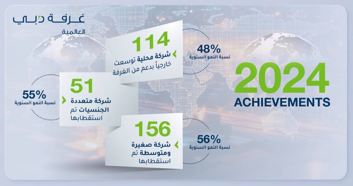 وتضمنت قائمة الشركات التي استقطبتها الغرفة خلال العام الماضي 51 شركة متعددة الجنسية مقارنة بـ 33 شركة في 2023، بنمو بنسبة 55%، كما استقطبت الغرفة 156 شركة صغيرة ومتوسطة في 2024 بنسبة زيادة بلغت 56% مقارنة مع 100 شركة تم استقطابها خلال 2023. ونجحت غرفة دبي العالمية في 2024 بدعم توسع 114 شركة محلية إلى أسواق عالمية جديدة، بنمو بنسبة 48% مقارنة بـ 77 شركة محلية تم دعم توسعها في العام 2023.