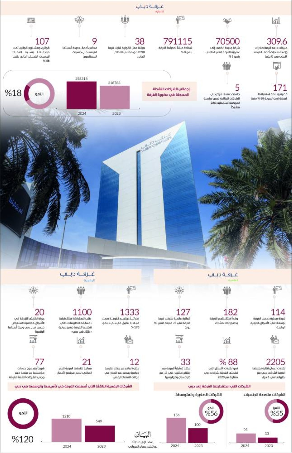 واصلت غرف دبي خلال عام 2024 تحقيق إنجازات استثنائية، أسهمت في تحفيز النمو الاقتصادي، ودعم بيئة الأعمال، عبر ابتكار حلول جديدة وفعالة، تخدم كل القطاعات التجارية والصناعية، بما يتواكب مع استراتيجيتها المحفزة للنمو الاقتصادي المستدام، بما يتماشى مع أهداف أجندة دبي الاقتصادية ( D33 )، التي تسعى إلى مضاعفة حجم اقتصاد دبي بحلول عام 2033 ، وترسيخ مكانتها ضمن أفضل 3 مدن اقتصادية حول العالم.