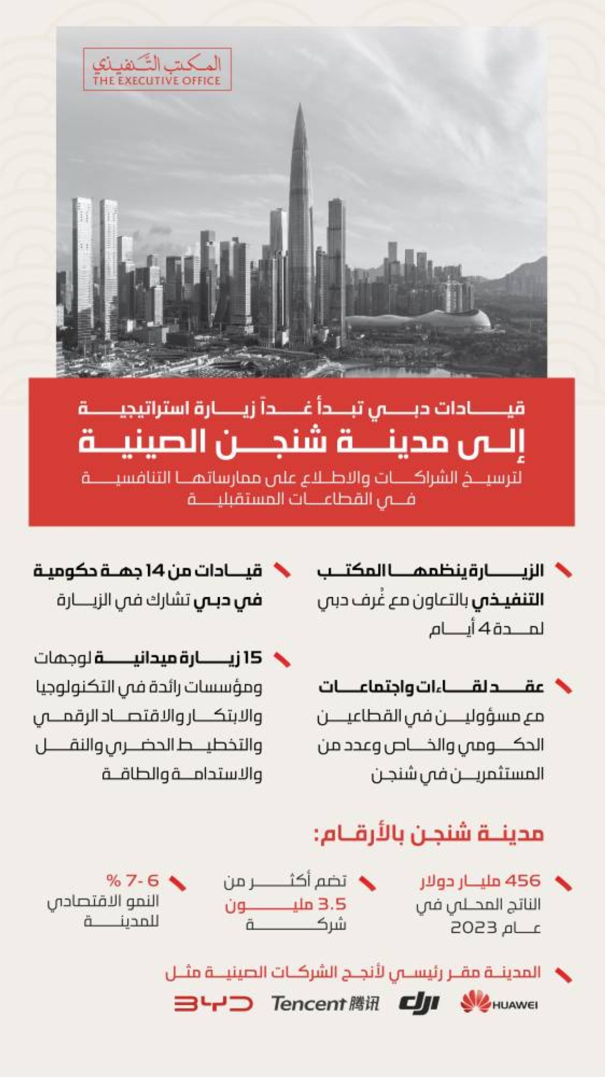 وتأتي زيارة وفد قيادات دبي إلى مدينة شنجن الصينية لما تتمتع به المدينة من مكانة رائدة في العديد من القطاعات، كما يبلغ الناتج المحلي للمدينة 456 مليار دولار في عام 2023 وتضم أكثر من 3.5 مليون شركة مسجلة، كما تعرف المدينة بأنها "وادي السيليكون في الشرق"، إذ شهدت نمواً اقتصادياً سريعاً في السنوات الأخيرة بلغ 6-7٪، وكانت شنجن واحدة من أول 5 مدن في الصين تستفيد من حرية المنطقة الاقتصادية الخاصة (SEZ)، وبدأت كمدينة للتصنيع والتوريد لهونغ كونغ، ومع مرور الوقت، وسعت الصين هذا النموذج ليشمل أكثر من 100 مدينة، لكن شنجن حافظت على تنافسيتها بفضل تخصصها في التكنولوجيا والتصنيع المتقدم.