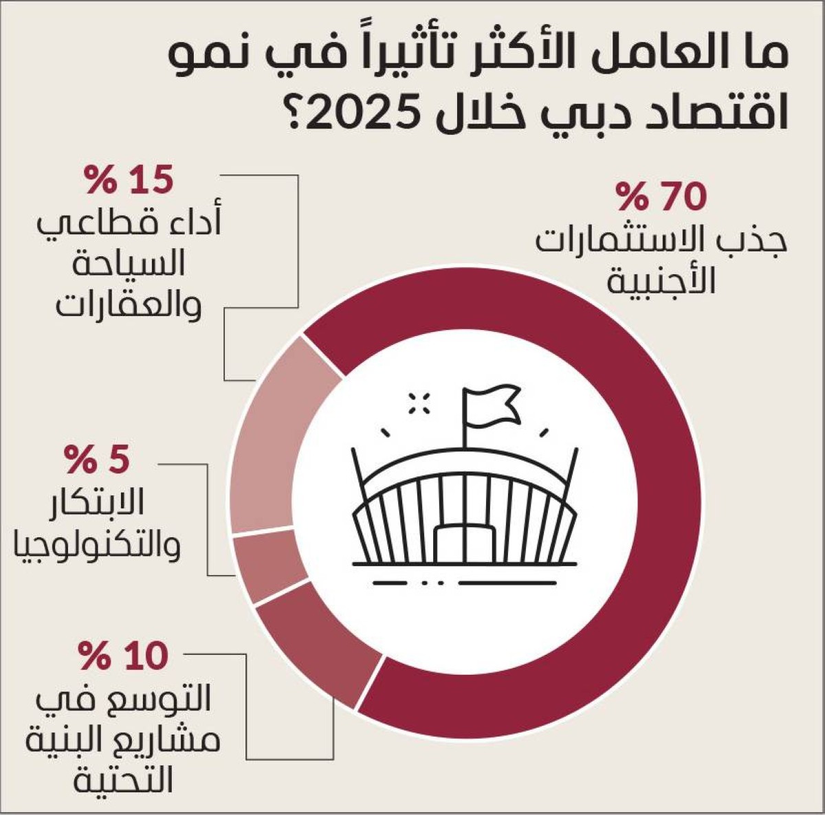 وحول العامل الأكثر تأثيراً في نمو اقتصاد دبي خلال 2025، أكد 70 % من المشاركين أن تدفقات الاستثمارات الأجنبية لها دور بارز في الأداء الاقتصادي للإمارة، ولا سيما أن دبي لا تزال تحقق معدلات نمو سنوي عالية في جذب الاستثمارات الأجنبية من جميع أنحاء العالم، بالمقابل أفاد 15 % من المشاركين بأن أداء قطاعي السياحة والعقارات له الدور الأبرز في التأثير على نمو اقتصاد دبي.