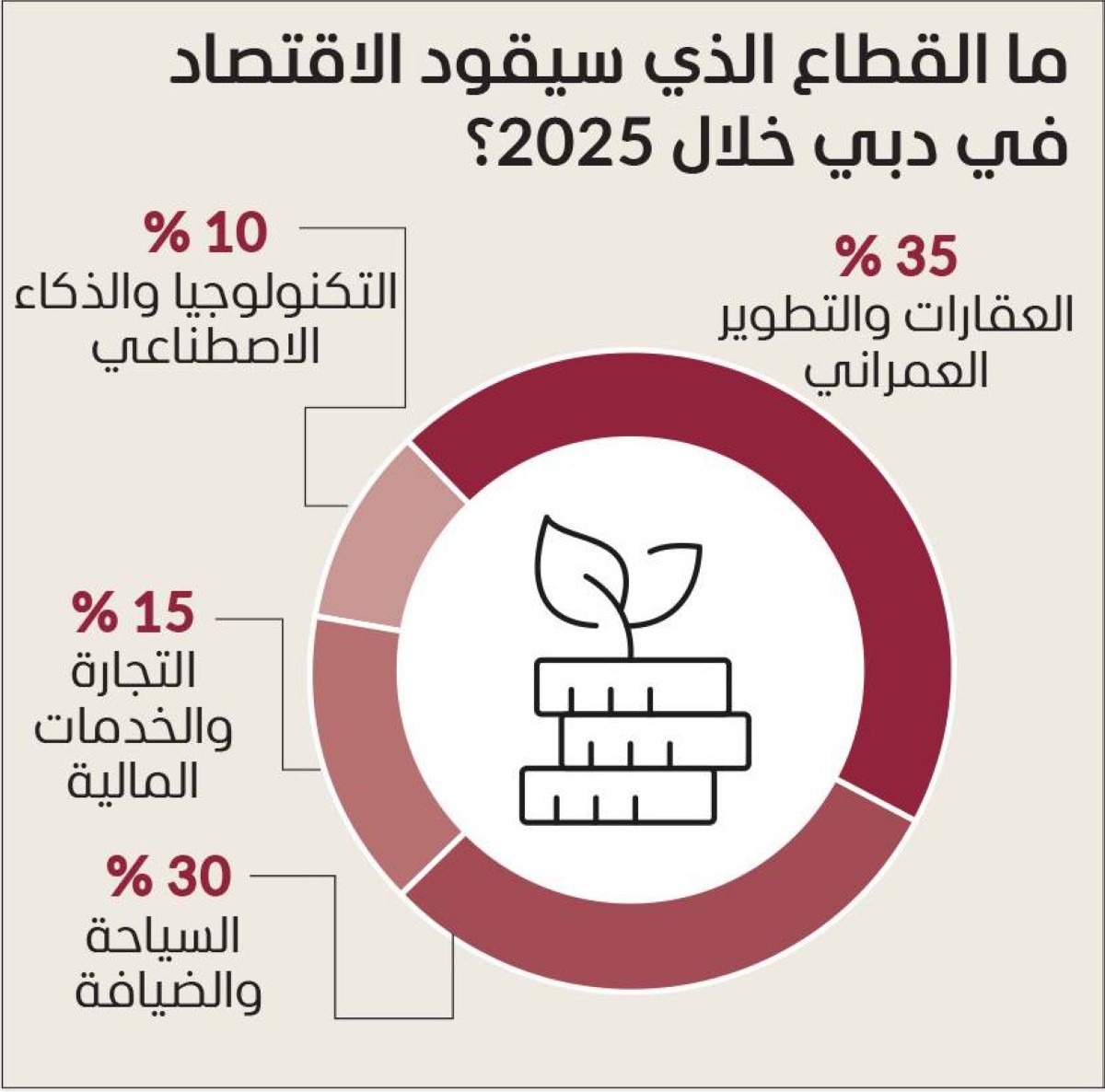 من جهة أخرى، توقع 45 % من المشاركين أن قطاع العقارات والتطوير العمراني هو الذي الذي سيقود نمو اقتصاد دبي خلال عام 2025، بينما اختار 30 % من المستَطلعين قطاع السياحة والضيافة، و15 % صوتوا على قطاع التجارة والخدمات المالية، و10 % على قطاع التكنولوجيا والذكاء الاصطناعي.