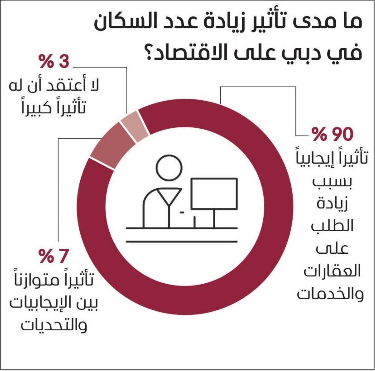 وفيما يتعلق بمدى تأثير زيادة عدد السكان في دبي على الاقتصاد، ولا سيما مع اقتراب عدد سكان الإمارة من 4 ملايين نسمة، توقع 90 % من المستطلعين أن يكون له تأثير إيجابي بسبب زيادة الطلب على العقارات والخدمات، ورأى 7 % من المشاركين أنه سيكون له تأثير متوازن بين الإيجابيات والتحديات، وتوقع 3 % ألا يكون له تأثير كبير.