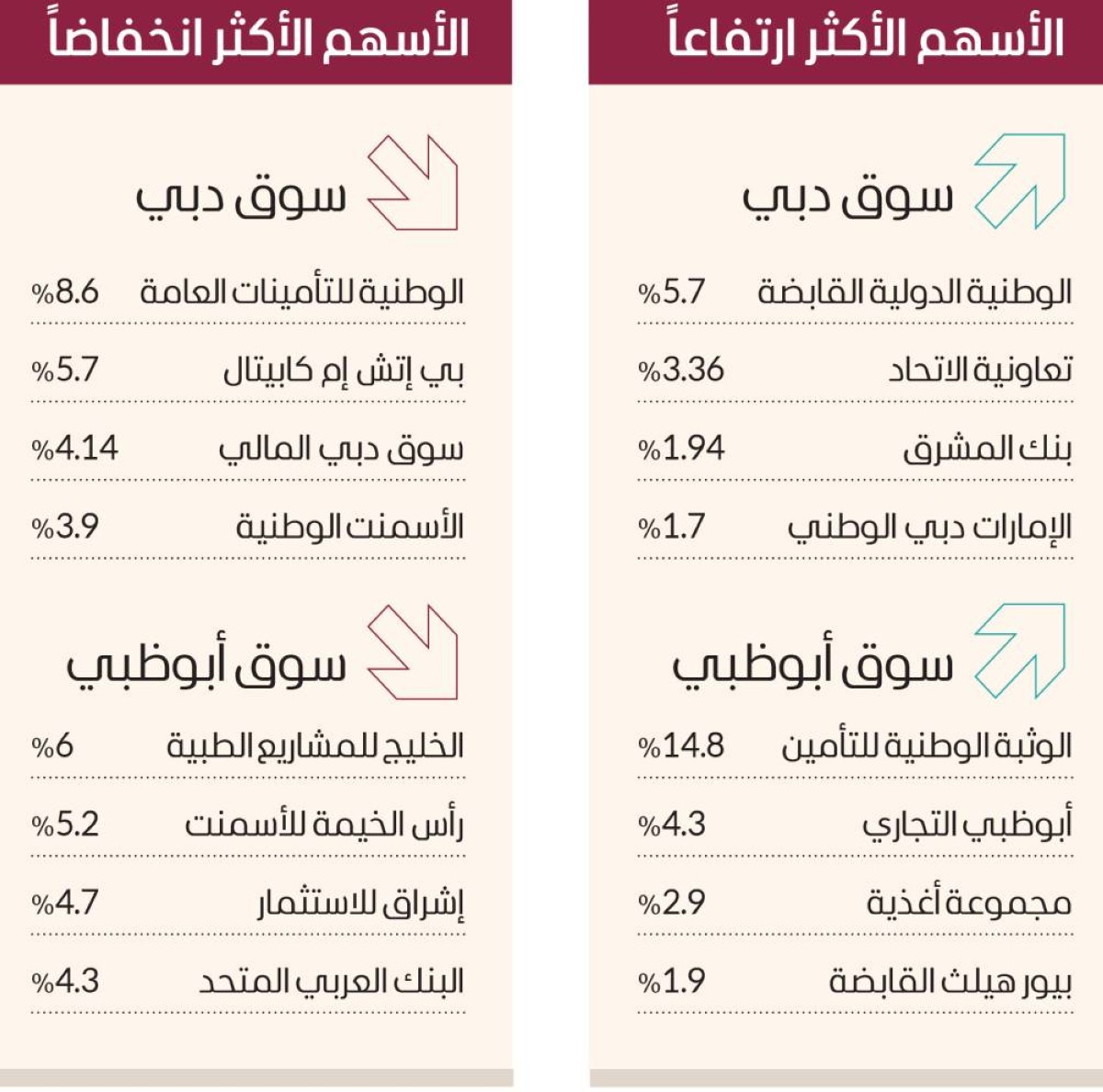 وصعدت في سوق أبوظبي أسهم الوثبة الوطنية للتأمين 14.8%، وأبوظبي التجاري 4.3%، ومجموعة أغذية 2.9%، وبيور هيلث القابضة 1.9%، وأدنوك للغاز 1.76%.