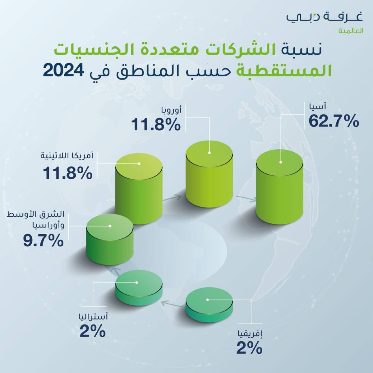 وأظهرت الغرفة تنوعاً في جنسيات وأسواق الشركات متعددة الجنسيات التي جذبتها عبر شبكة مكاتبها التمثيلية الخارجية حول العالم، حيث استحوذت أمريكا اللاتينية على 11.8% من اجمالي الشركات متعددة الجنسيات التي جذبتها غرفة دبي العالمية خلال العام الماضي، في حين استحوذت أوروبا على ذات النسبة (11.8%)، فيما بلغت حصة منطقة الشرق الأوسط وأوراسيا 9.7%. وبلغت حصة القارة الافريقية 2% من إجمالي الشركات التي تم استقطابها، وكذلك استراليا بنسبة 2%.