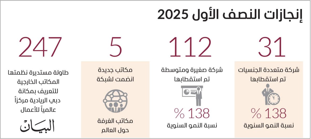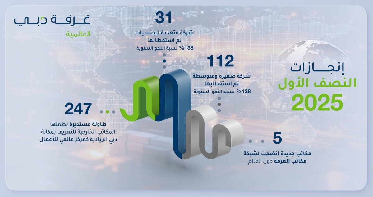 ونجحت غرفة دبي العالمية خلال النصف الأول من العام الجاري في استقطاب 143 شركة متنوعة تشمل شركات متعددة الجنسية وشركات صغيرة ومتوسطة، مقارنة بـ 60 شركة تم استقطابها خلال الفترة ذاتها من 2024، لتحقق بذلك نمواً 138% في عدد الشركات التي تم جذبها إلى دبي من قبل الغرفة.