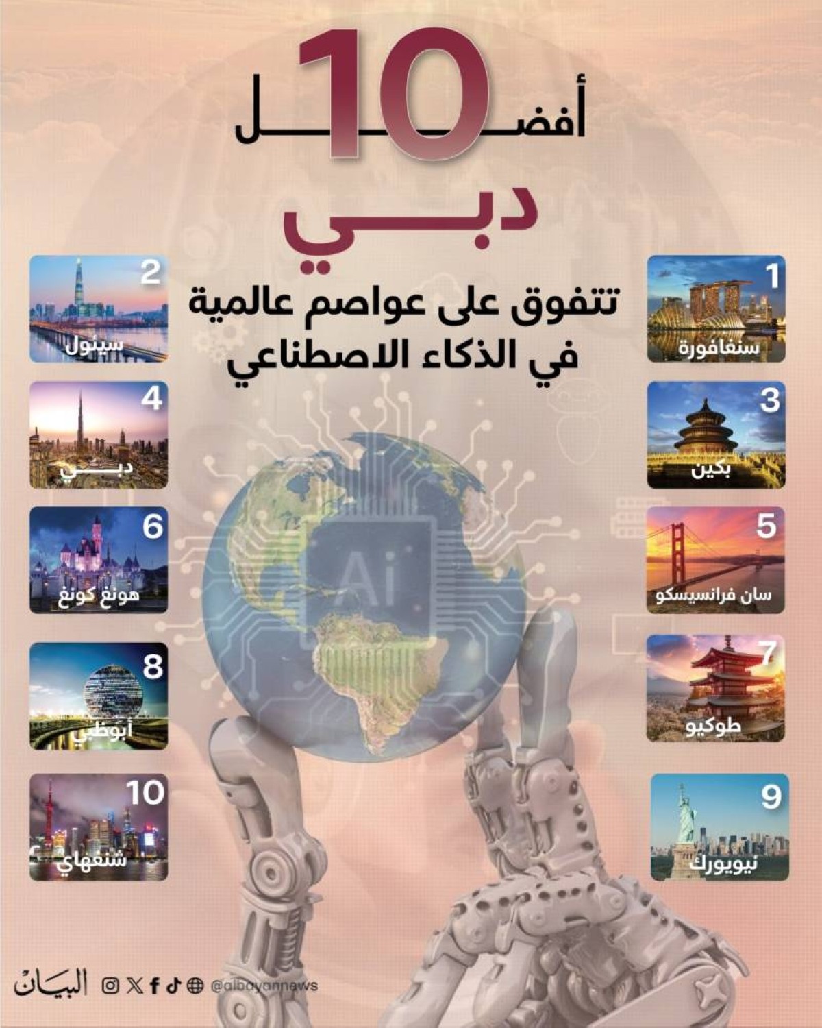 فيما ضمّت المراتب العشر الأولى أيضاً مدينة أبوظبي لتحتل المركز الثامن، ما يعزز مكانة الإمارات بوصفها الدولة الوحيدة في الشرق الأوسط التي تضم مدينتين ضمن نادي الذكاء الاصطناعي العالمي، بينما حلت هونغ كونغ في المركز السادس وطوكيو في المركز السابع ونيويورك في المركز التاسع وشنغهاي في المركز العاشر.
