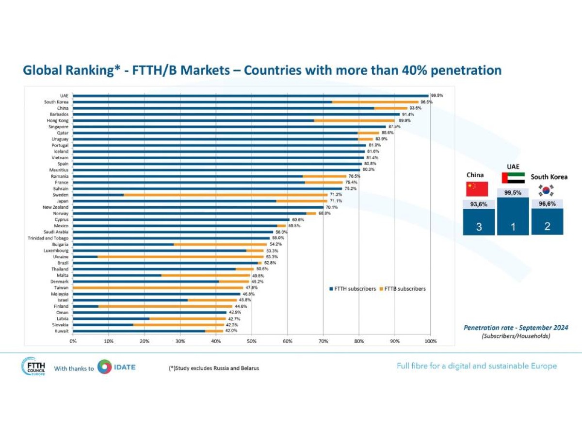 حقَّقَت دولة الإمارات رقمًا قياسيًّا جديدًا في نسبة شبكات الألياف الضوئية الموصولة إلى المنازل، بلغ 99.5%، لتحتفظ بذلك بالمركز الأول عالميًّا منذ عام 2016، وذلك بحسب التقرير السنوي الذي أصدره المجلس الأوروبي للألياف الضوئية الموصولة للمنازل، عن بيانات عام 2024.