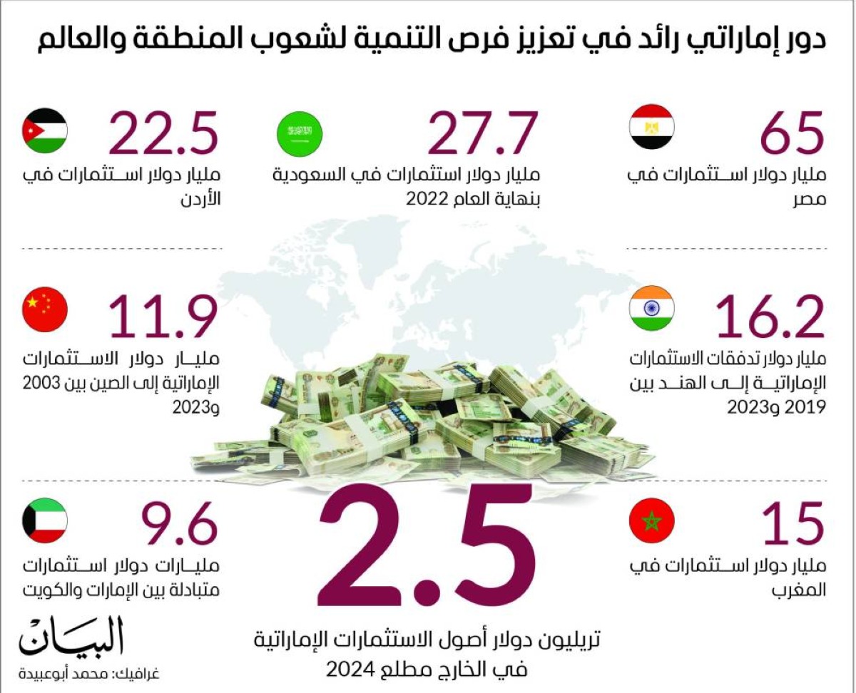 تواصل دولة الإمارات تعزيز إسهامها في مشهد التنمية الاقتصادية إقليميا وعالميا، عبر حزم من الاستثمارات الخارجية العملاقة، وفق رؤية إستراتيجية شاملة تهدف إلى فتح أوسع آفاق النمو أمام اقتصادها المحلي، ودعم اقتصادات الدول الشقيقة والصديقة، بما يعزز من فرص التنمية والازدهار لشعوب المنطقة والعالم.