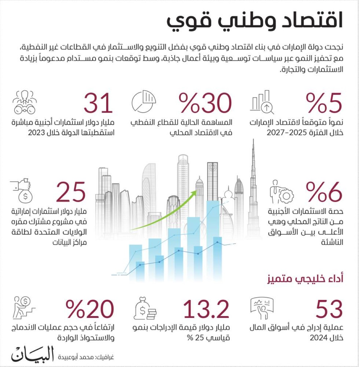 وأشار إلى توقعات صندوق النقد الدولي بأن يسجل الاقتصاد الإماراتي نمواً متسارعاً بنحو 5 % خلال الفترة ما بين عامي 2025 و2027 مقارنة بنسبة 4 % المسجلة في 2024، ويعد هذا النمو القوي ثمرة جهود التنويع الاقتصادي وجاذبية البيئة الاستثمارية للإمارات.