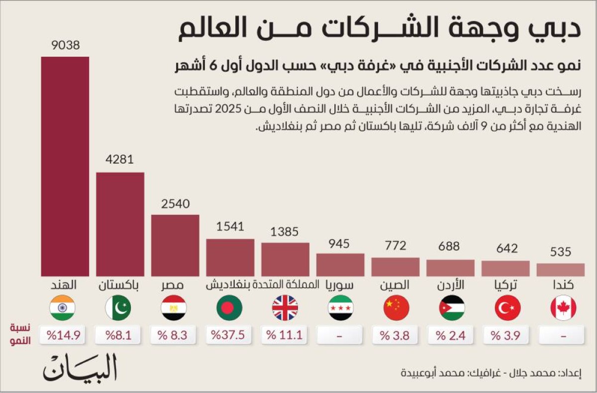 وجاءت سوريا في المركز السادس مع انضمام 945 شركة جديدة إلى عضوية غرفة تجارة دبي خلال النصف الأول من 2025 واحتلت الشركات الصينية المركز السابع بانضمام 772 شركة جديدة بنمو 3.8% على أساس سنوي، وجاء الأردن في المركز الثامن بانضمام 688 شركة جديدة بنمو 2.4% وحصدت تركيا المركز التاسع بواقع 642 شركة جديدة بنمو 3.9%، بينما جاءت كندا في المركز العاشر بانضمام 535 شركة جديدة.