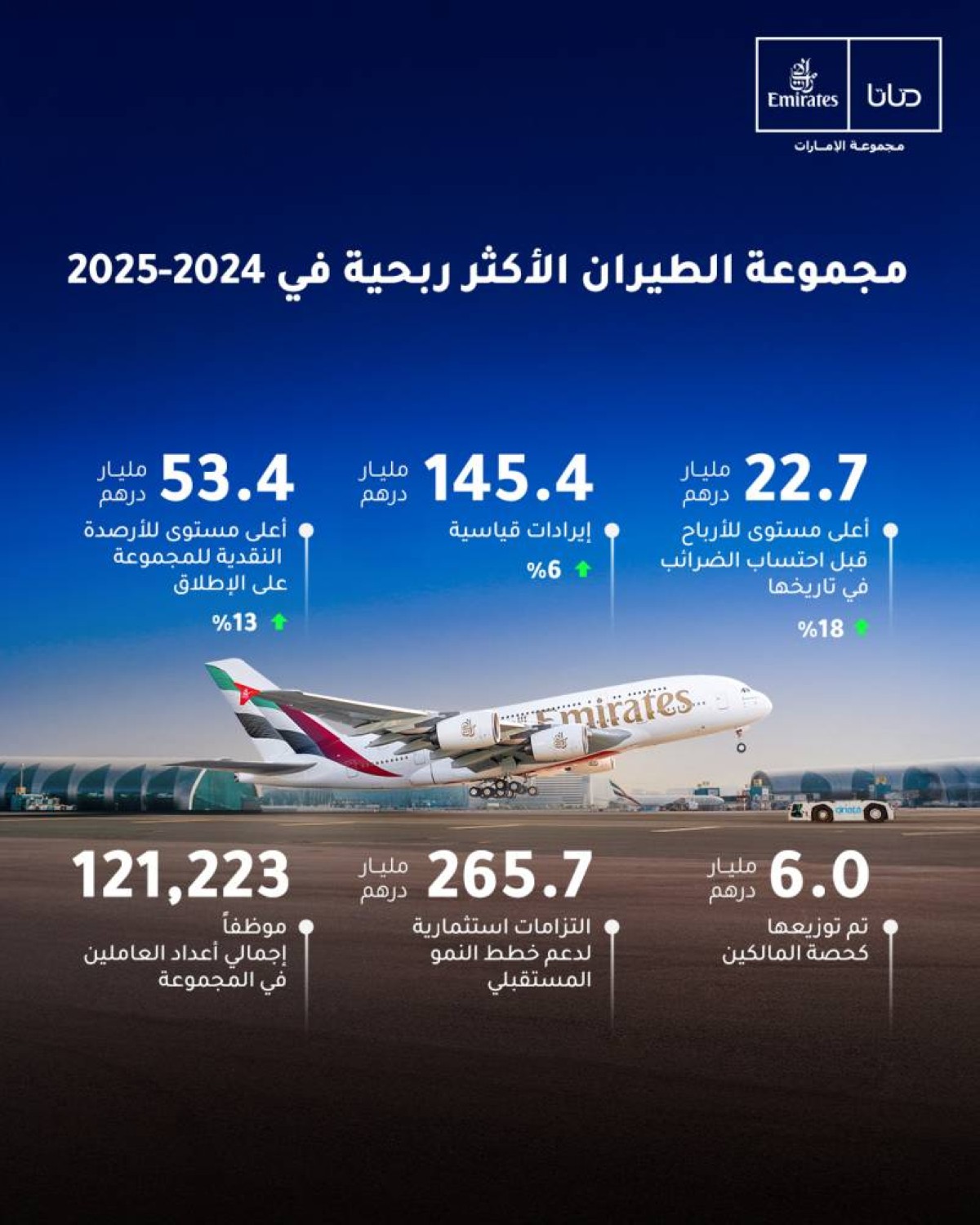 أعلن سمو الشيخ أحمد بن سعيد آل مكتوم، رئيس هيئة دبي للطيران المدني رئيس مطارات دبي الرئيس الأعلى الرئيس التنفيذي لطيران الإمارات والمجموعة، أن مجموعة الإمارات سجلت نتائج قياسية غير مسبوقة خلال السنة المالية 2024–2025، لتصبح المجموعة الأكثر ربحية في قطاع الطيران العالمي، مؤكداً سموه أن هذا الإنجاز هو ثمرة الرؤية الاستشرافية لصاحب السمو الشيخ محمد بن راشد آل مكتوم، نائب رئيس الدولة رئيس مجلس الوزراء حاكم دبي، رعاه الله، والتي أرست أسس التميز والتفوق في قطاع الطيران، وجعلت من دبي حاضنةً لأبرز الكيانات العالمية في هذا المجال.