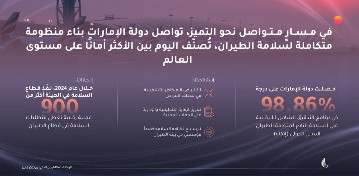 أطلقت الهيئة العامة للطيران المدني تقريرها الثاني ضمن سلسلة تقارير تحليلية، بعنوان «رؤية من الداخل: الطيران المدني في دولة الإمارات»، وأكد التقرير أن دولة الإمارات تواصل بناء منظومة متكاملة لسلامة الطيران، تُصنّف اليوم بين الأكثر أماناً على مستوى العالم، حيث حصلت الدولة على درجة 98.86 % في برنامج التدقيق الشامل للرقابة على السلامة التابع لمنظمة الطيران المدني الدولي (إيكاو)، وهو من أعلى المعدلات العالمية، وذلك بفضل نهج رقابي صارم، وتوظيف التكنولوجيا، وتطوير الكوادر، وتطبيق أفضل الممارسات الدولية.