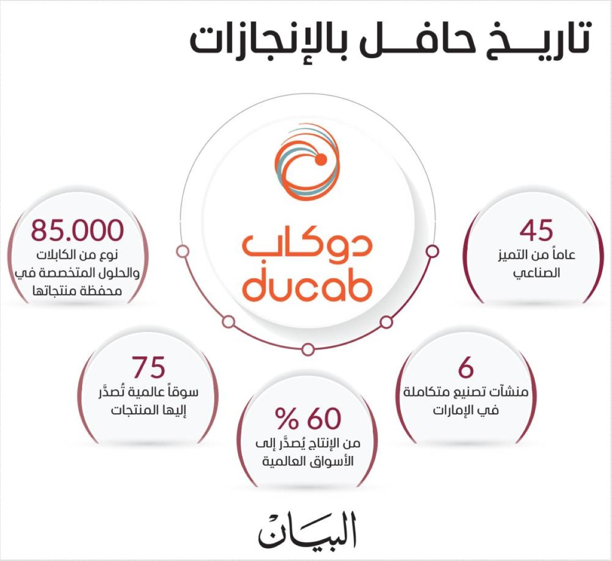 وتتمتع «دوكاب» بسجل حافل من الإنجازات في أكثر من 5 آلاف مشروع وشراكة عالمية ناجحة. وتعكس محفظة منتجاتها، التي تضم 85 ألف نوع من الكابلات المختلفة، المصنفة ضمن خمس عائلات أساسية.