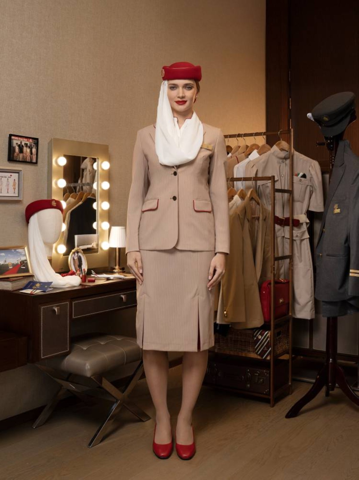 اكتمل المظهر بقميص كريمي وربطة عنق حمراء على شكل فيونكة، إضافة إلى قبعة حمراء تحمل شعار طيران الإمارات بالخط العربي الأنيق، ووشاح أبيض من الشيفون يتدلى برقة على الكتف. وتحتوي طيّات الوشاح على سبع طيّات ترمز إلى الإمارات السبع. أما الزي الرجالي غهو عبارة عن بدلات رمادية اللون مع قمصان بيضاء وربطات عنق حمراء وشارات ذهبية، وأحذية جلدية سوداء.