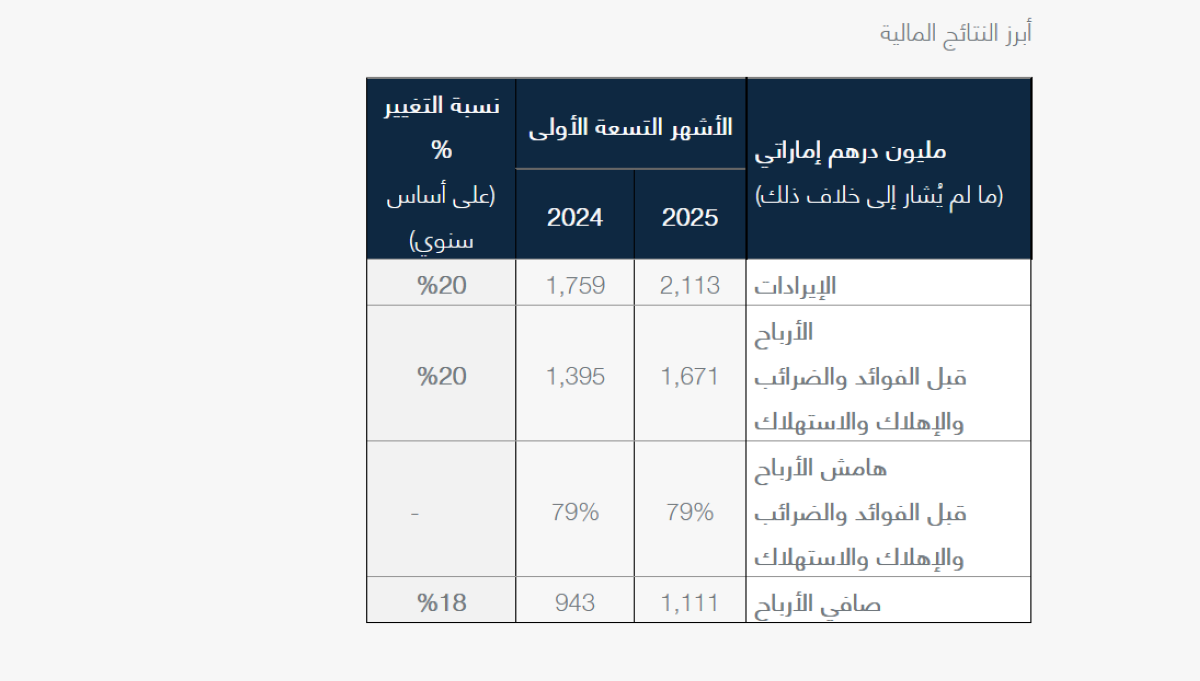• سجلت الأرباح قبل الفوائد والضرائب والإهلاك والاستهلاك نمواً بنسبة 13% على أساس سنوي لتصل إلى 563 مليون درهم إماراتي وبلغ هامش الربح 78%، بما يعكس نمواً قوياً في الإيرادات.